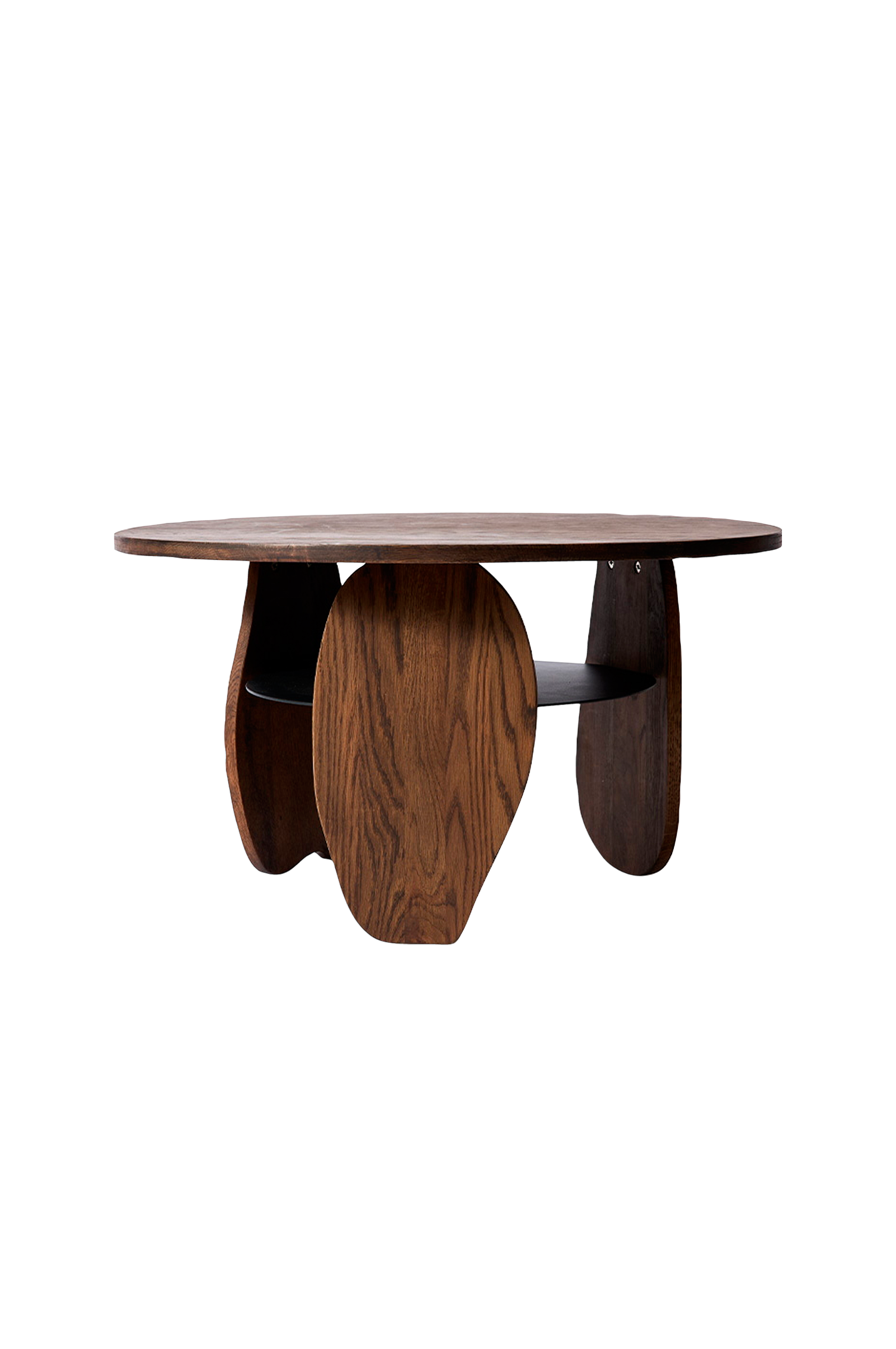 Sofabordet er designet med tre ben, hvert med sin egen unike og harmoniske form. Disse skulpturelle bena skaper visuell interesse og forvandler sofabordet til et funksjonelt "kunstverk" i innredningen. Bordplatens runde og myke form samler designet og innbyr til fellesskap rundt bordet.