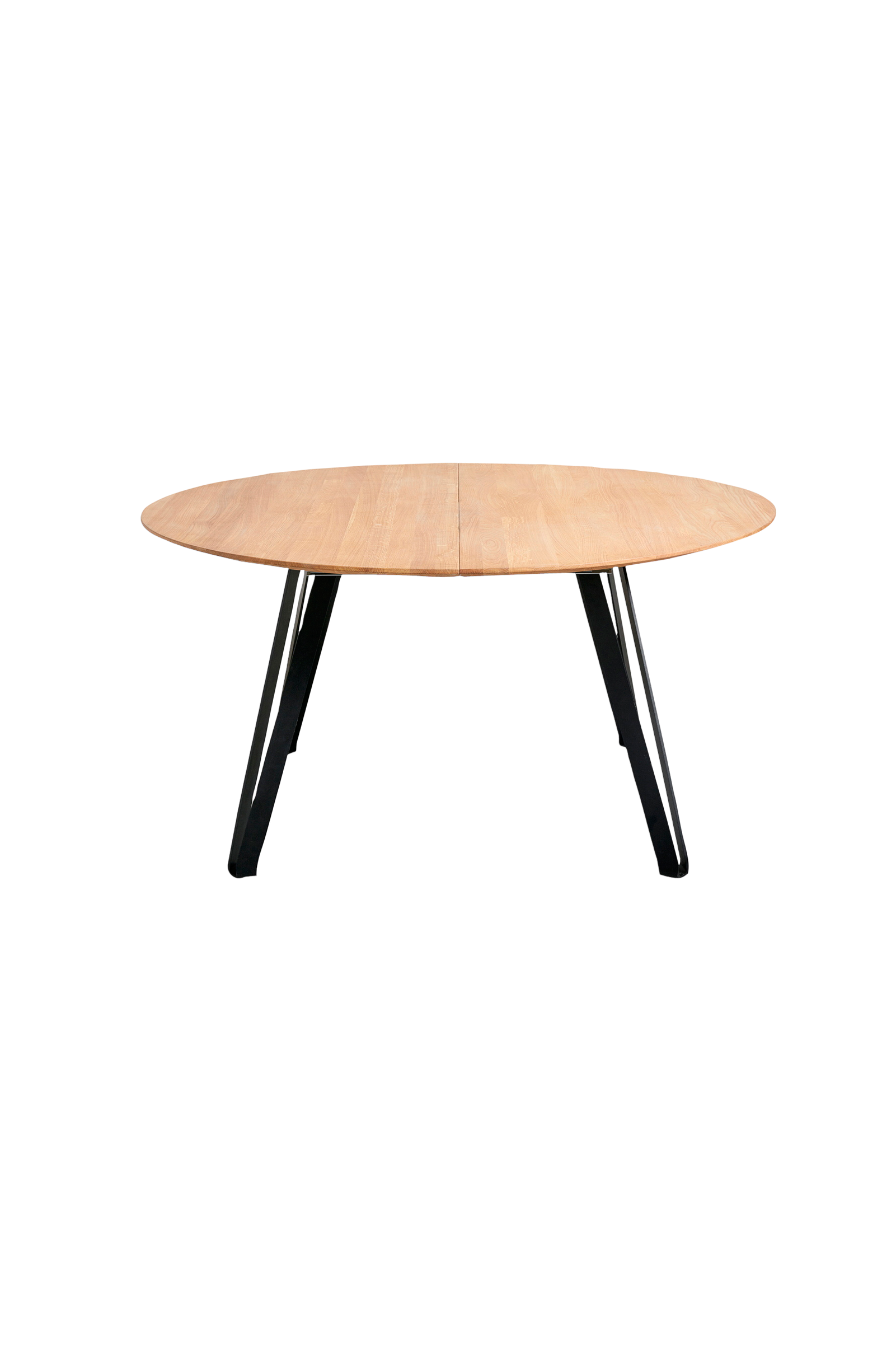 Bordplatene er tilgjengelige i røkt eik, naturoljet eik og svartbeiset eik, som er plassert oppå en dynamisk formet metallramme i svart, pulverlakkert jern.