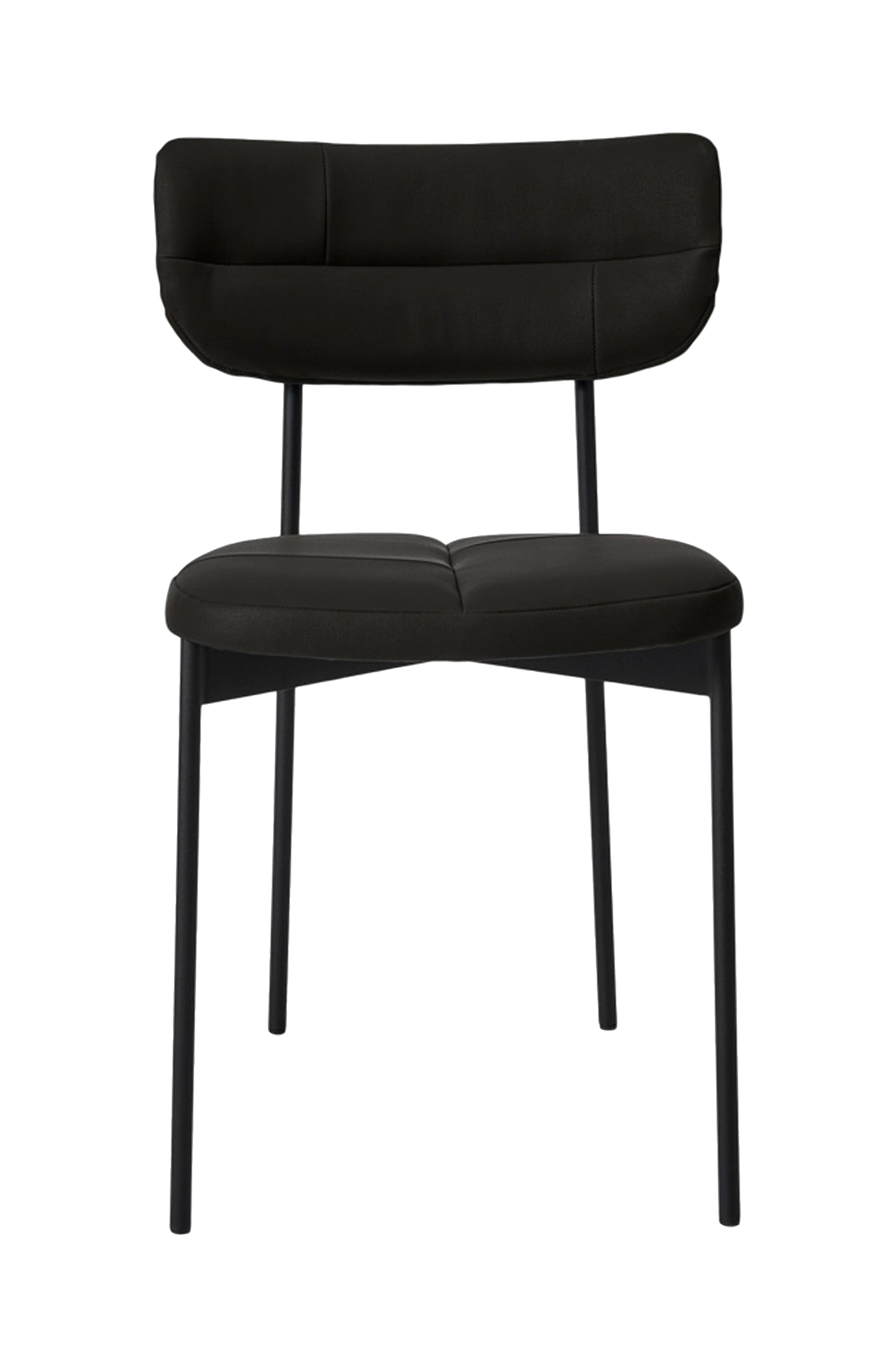 Rammen er laget av svart pulverlakkert metall, mens det organiske rygglenet og det brede setet av polyuretanskum gir utmerket støtte og høy komfort. Det svarte setet og ryggstøtten, som utfyller det mørke understellet, er laget av pu-skinn, noe som gjør stolen både slitesterk og holdbar.