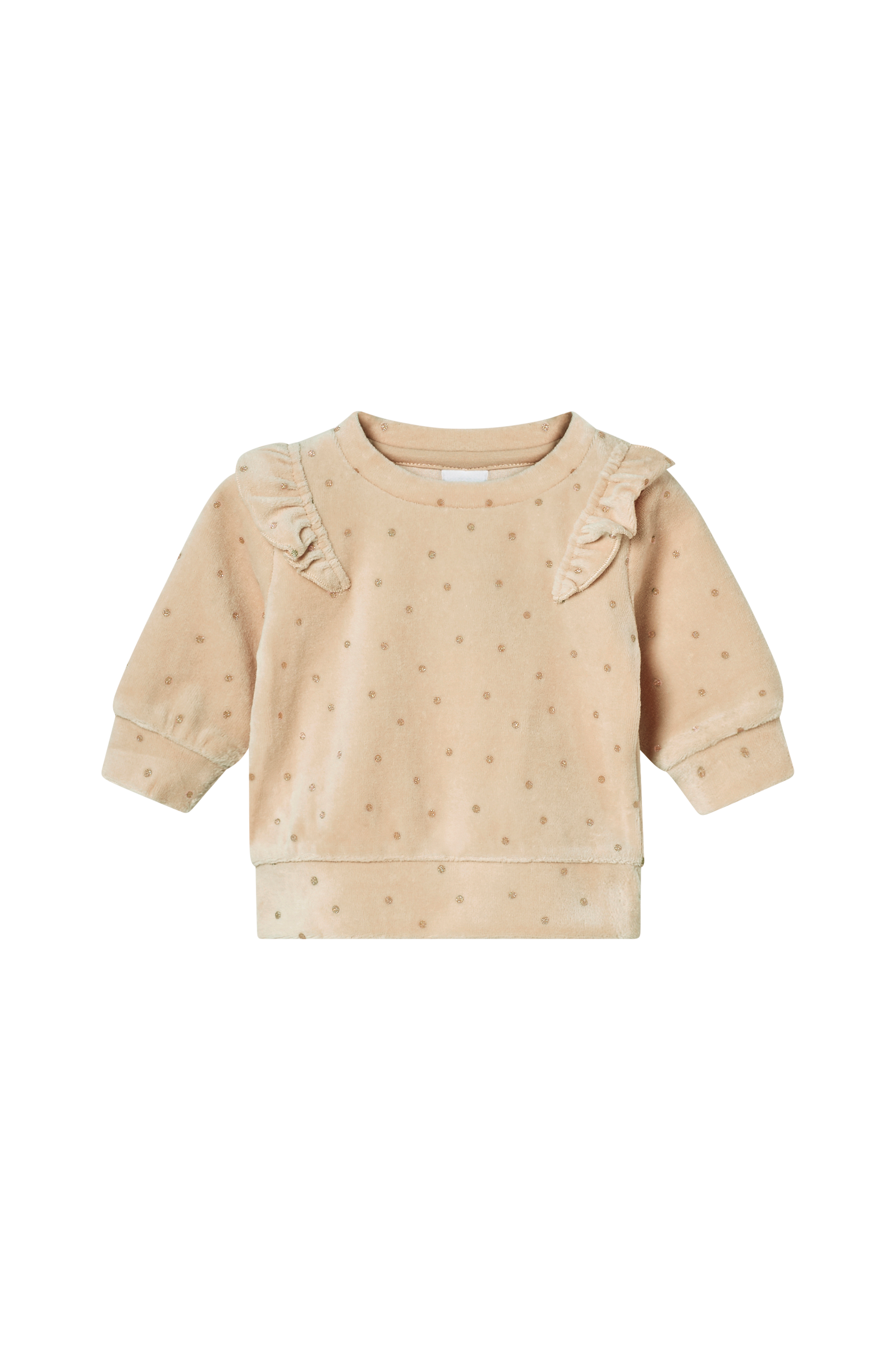 • Genser i myk velur med gullglitrende flekker rundt • Rund halsringning • Trykknapper på en skulder • Volanger rundt skuldrene • Mansjetter i ermeslutten og på bunnen • Produktet inneholder økologisk bomull som er dyrket uten kjemiske sprøytemidler, kunstgjødsel og genmodifiserte avlinger (GMO). Det innebærer et sunnere arbeidsmiljø for bønder og et bedre jordsmonn.