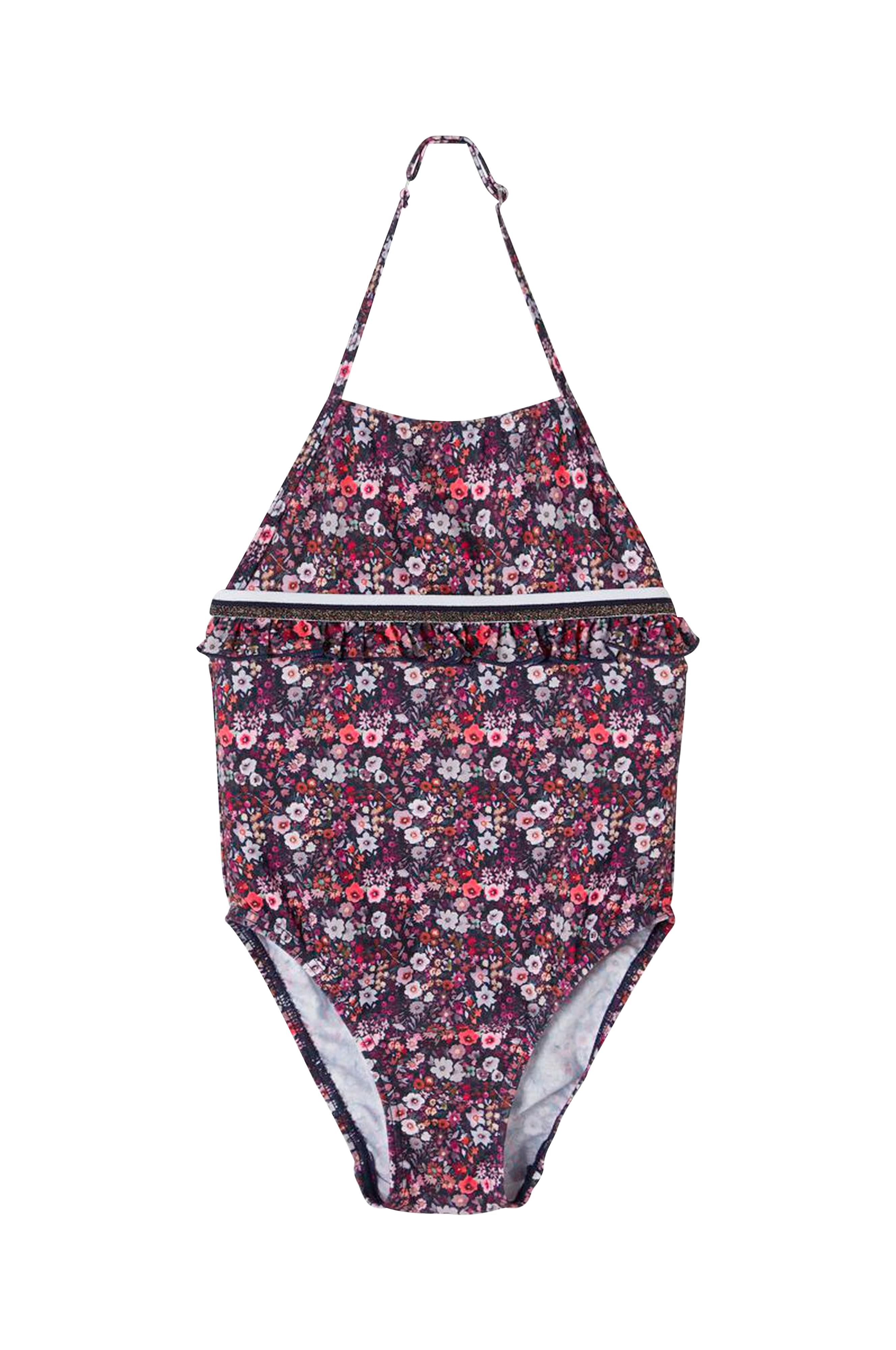 Mønstret badedrakt med stripete strikk og volang rundt øverst samt justerbart bånd i nakken.