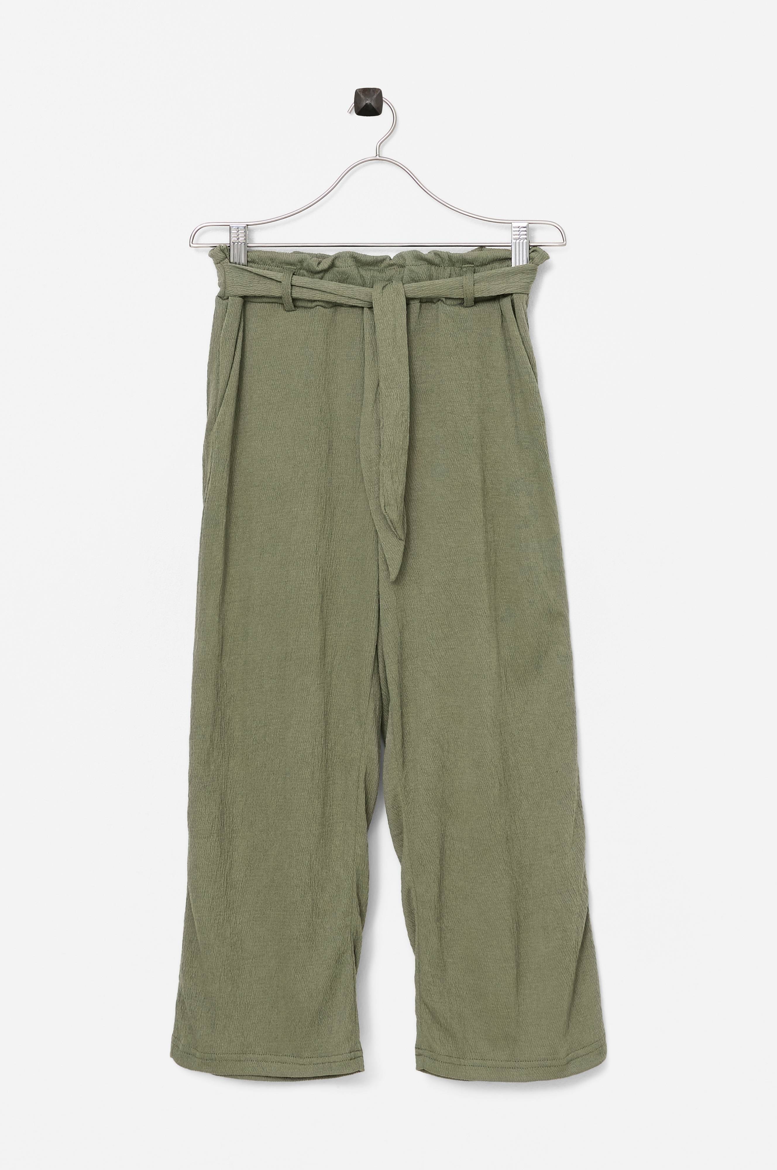 Modell i krinklet trikot med vide, rette ben. Påsydd linning med innfelt strikk som er justerbar på innsiden samt hemper med knytebelte på utsiden. To skrålommer foran.