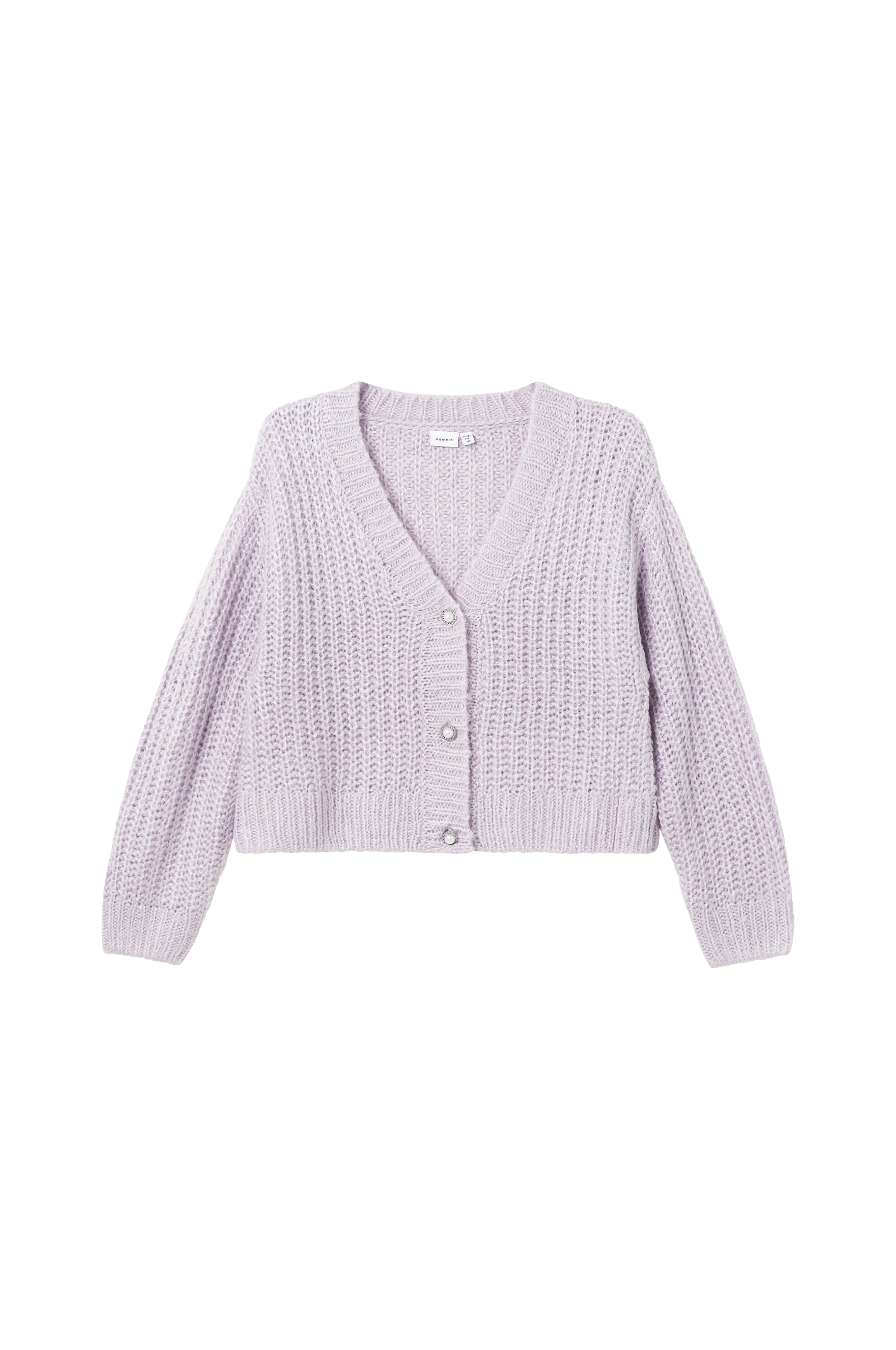 • Myk, strikket kardigan• Perleknapper• Ribbete kanter ved armenden og på bunnen