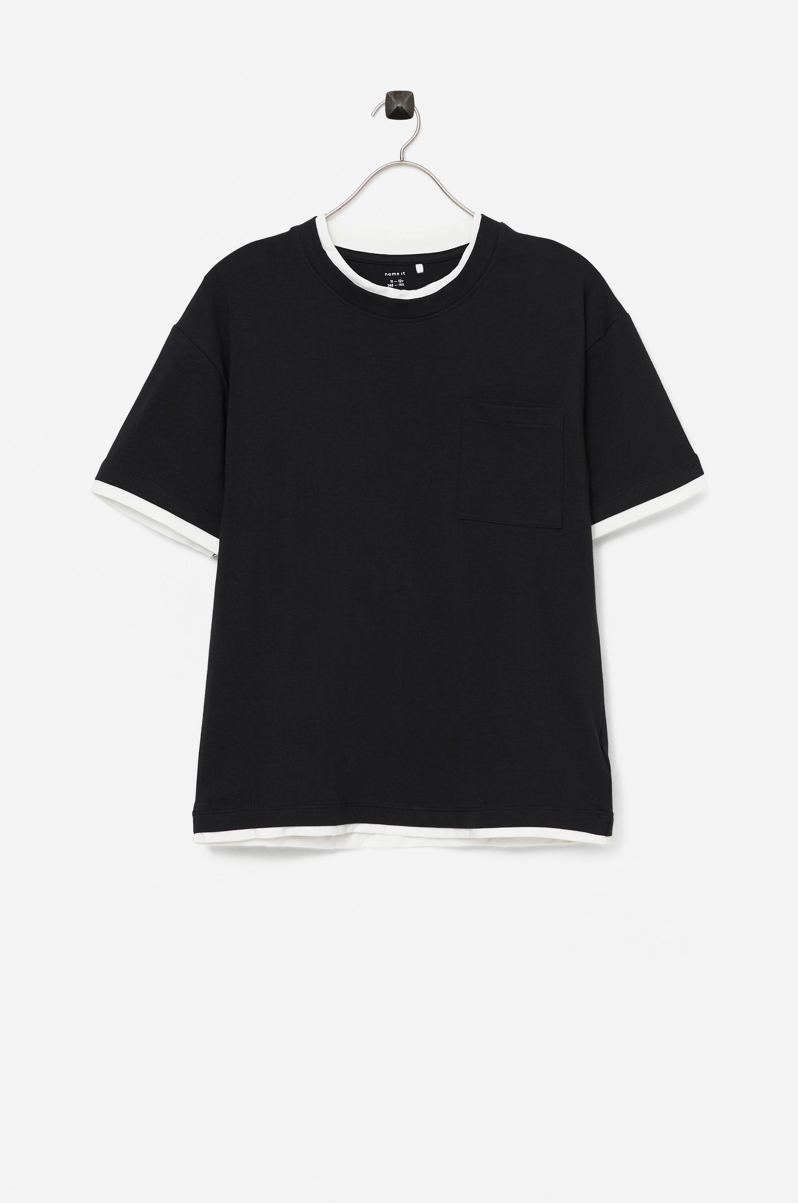 T-shirt i myk stretchtrikot med rund hals og en brystlomme. Kontrastfargede partier rundt halsen, erme- og nederkanten.