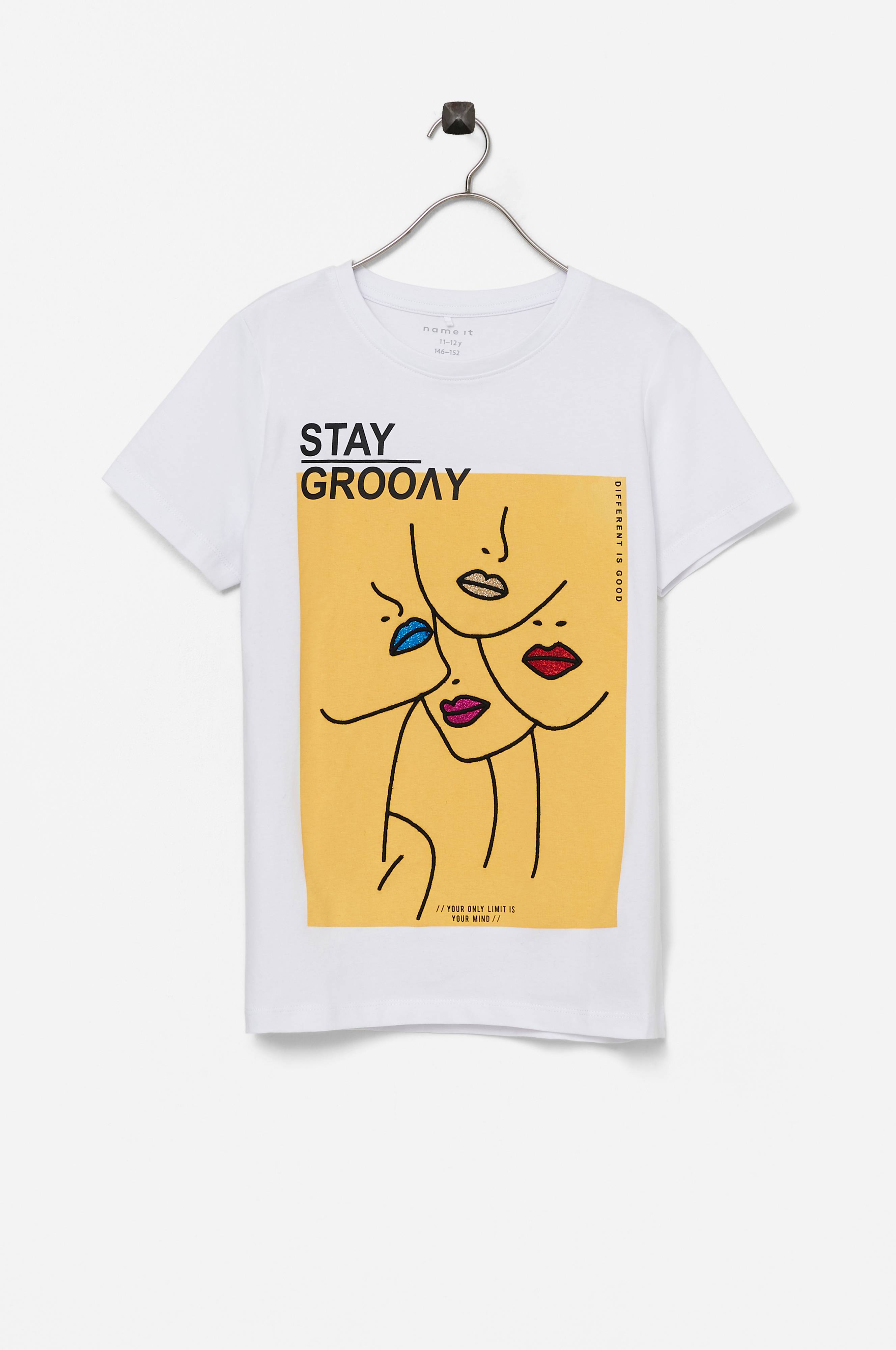 Kortermet topp i elastisk trikot av økologisk bomull. Broderi og trykk foran med glitrende innslag. Rund hals med vrangbord.