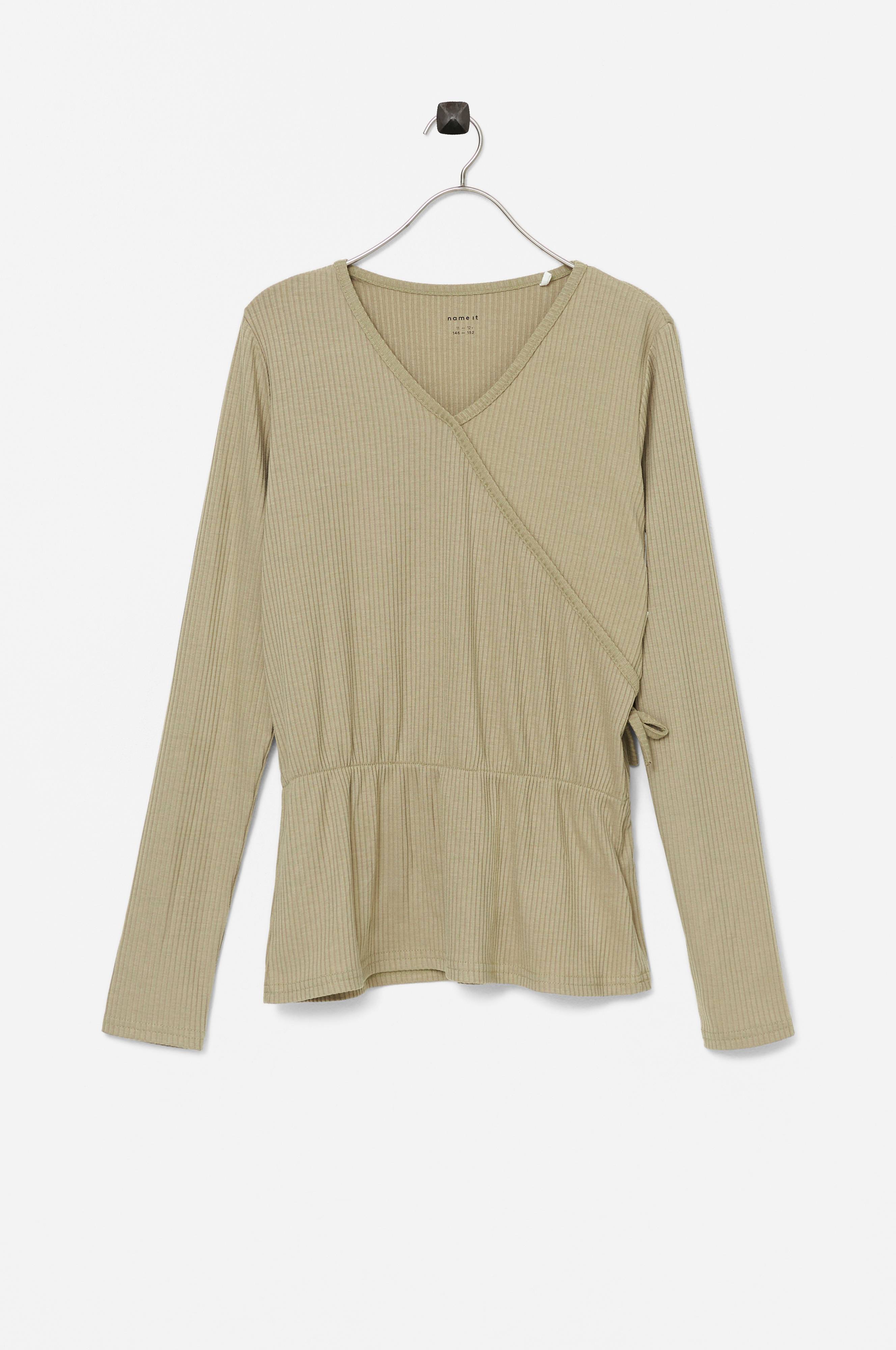 Omslagsmodell med innvendig strikk i midjen og dekorsløyfe i den ene siden. Myk, ribbestrikket trikot.