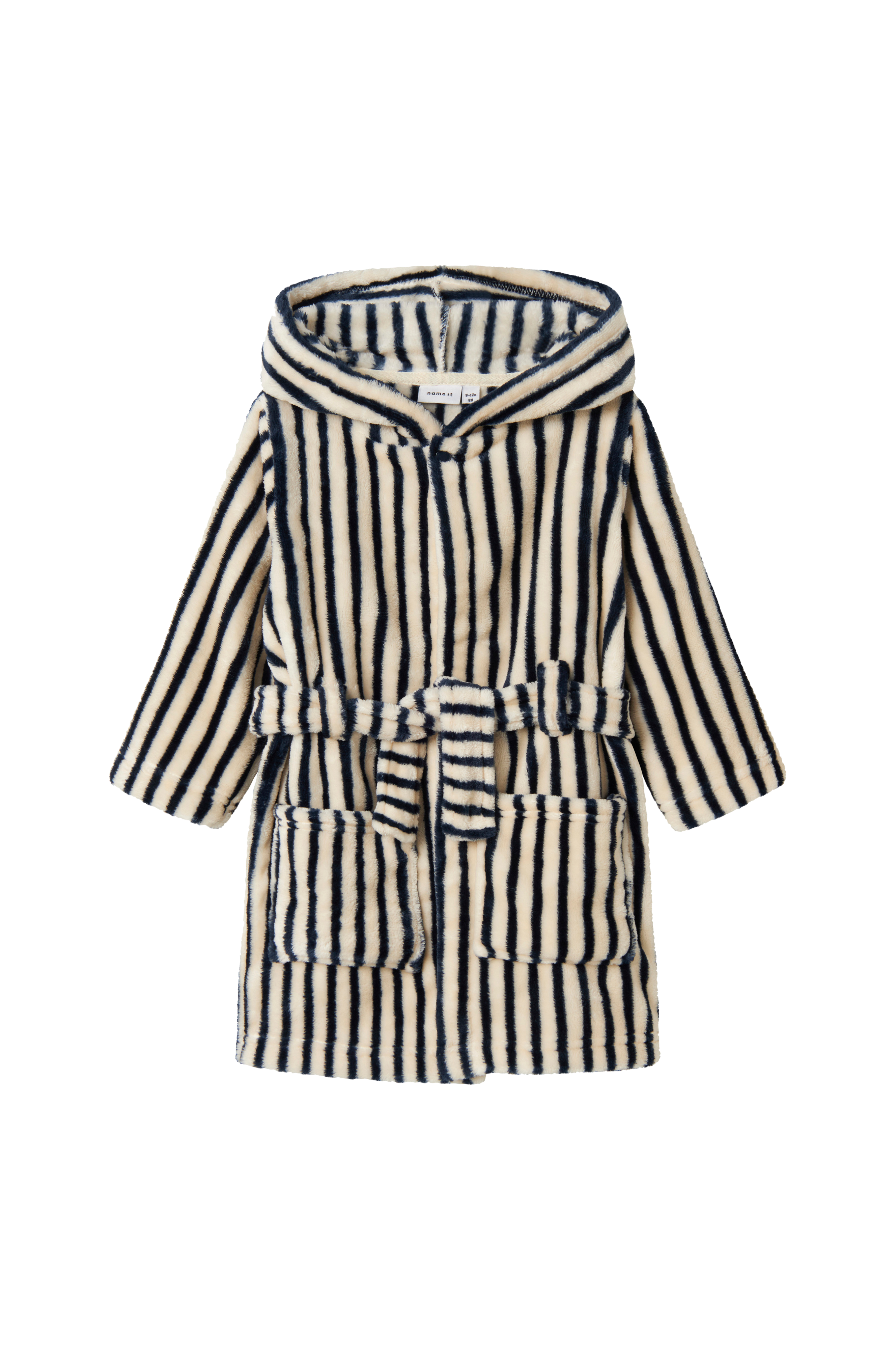• Stripete morgenkåpe i myk velur• Hette• Knytbart belte• To lommer• Trykknapp oppover foran