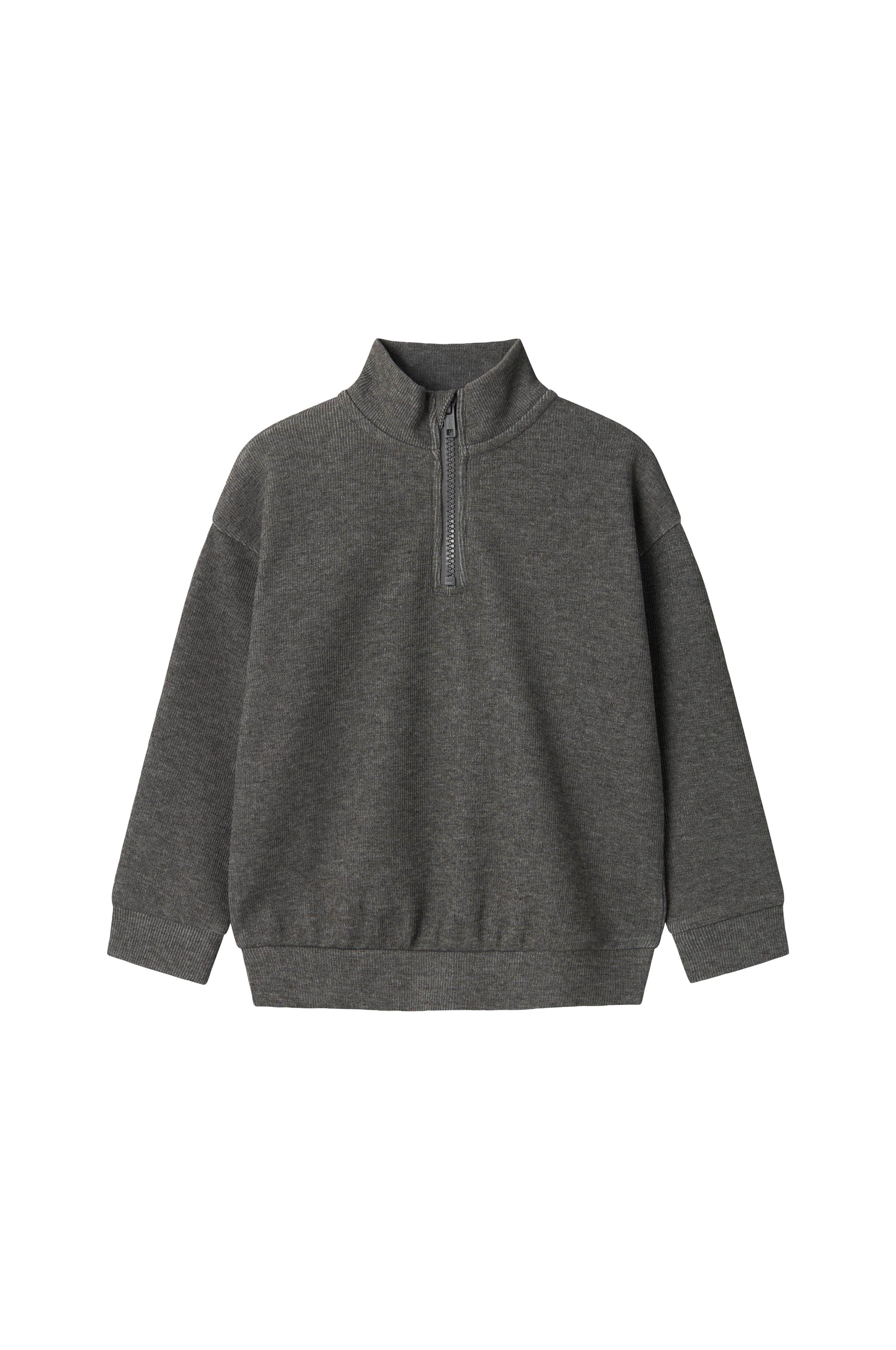 • Collegegenser i ribbet jersey• Høy, rund krage• Kort glidelås• Mansjetter i ermeslutten og på bunnen