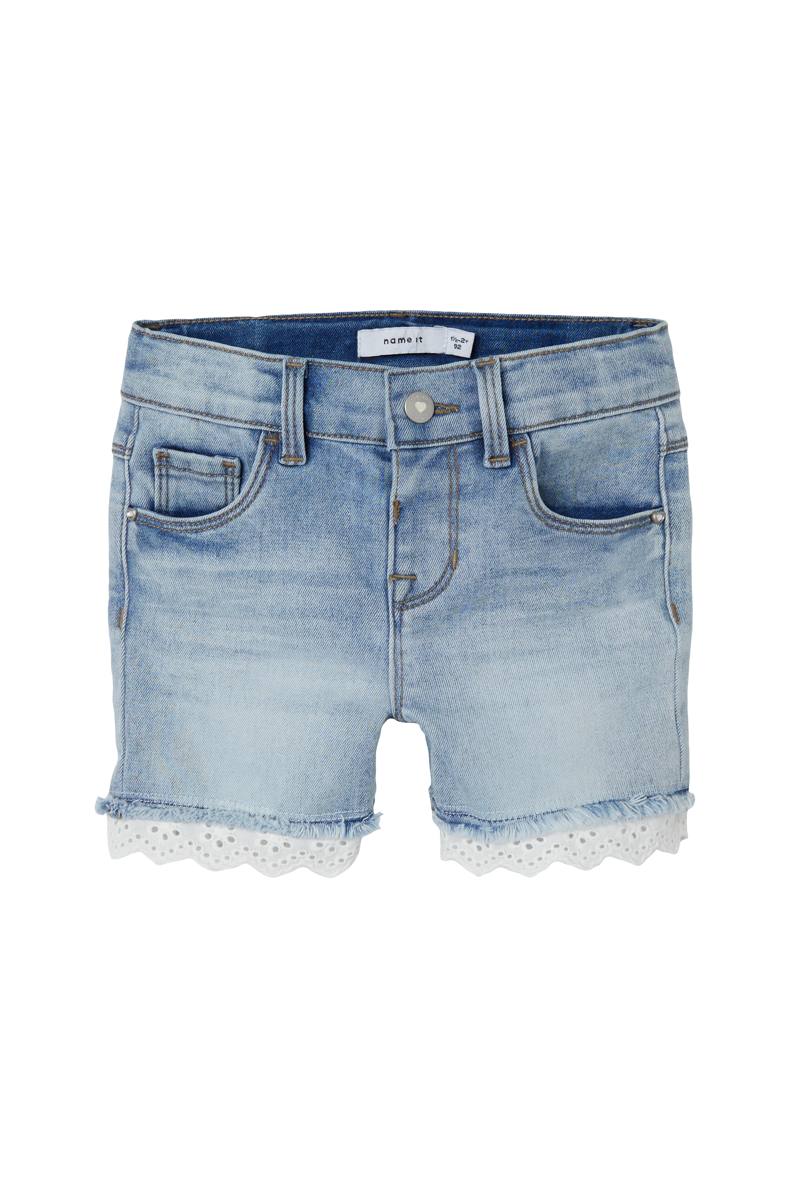 • Jeans-shorts i stretch denim• Justerbar midje• Tynn femlommemodell• Påsydd volangkant på bunnen med hullbroderi