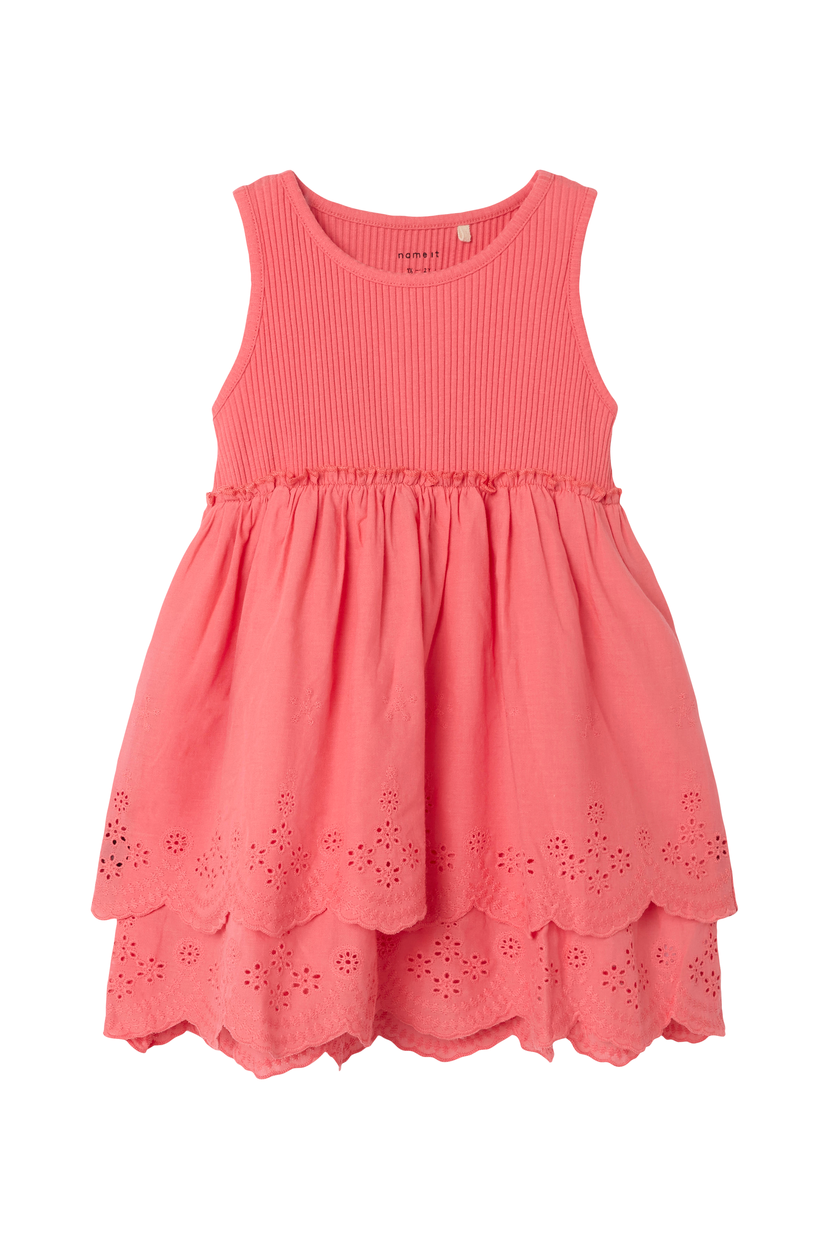 • Ermløs kjole med ribbet jerseytopp og vevd skjørt• Rund hals• Skjørt med doble volanger og hullbroderier i nedre kant