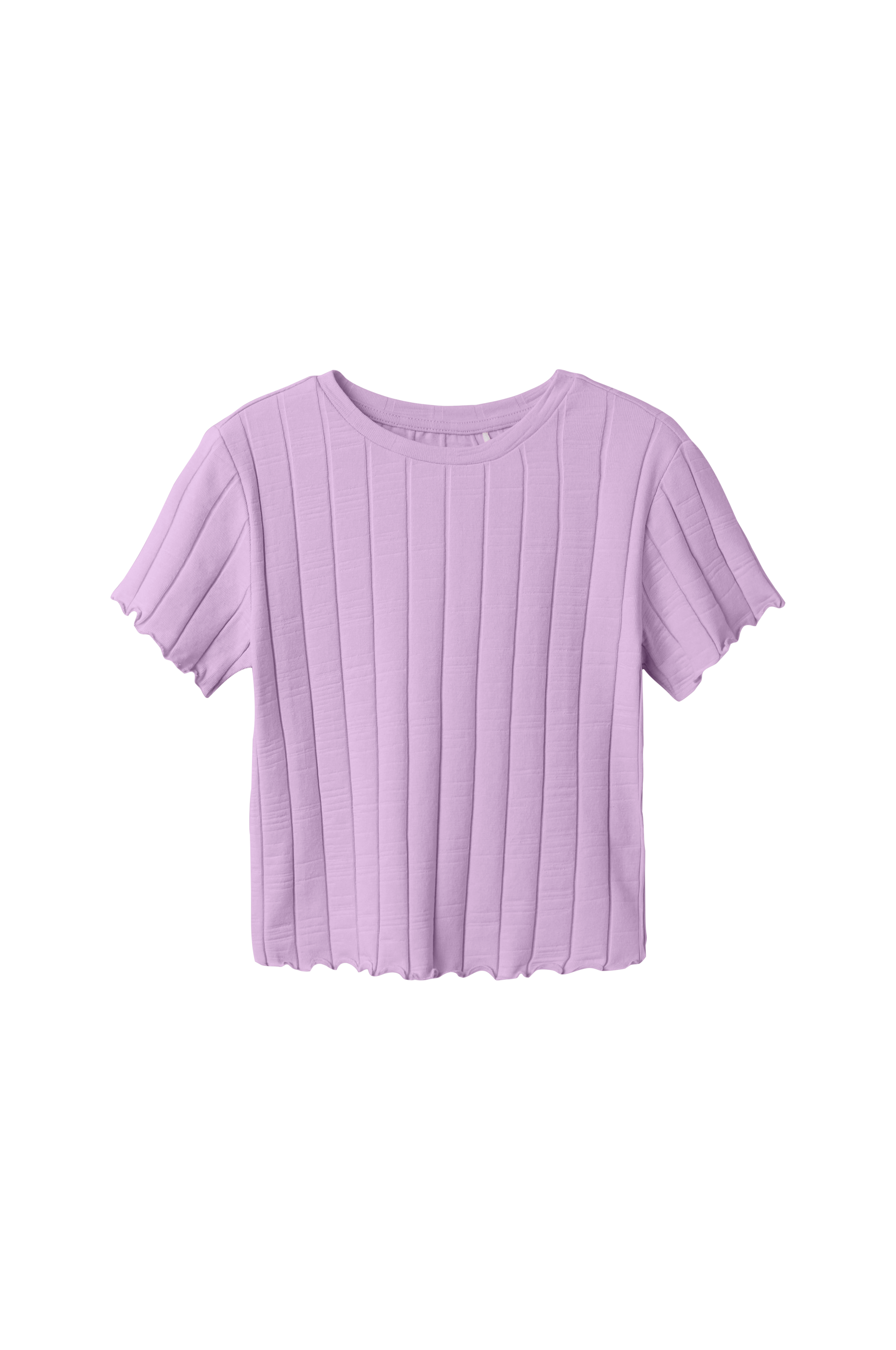 • Stretchy jersey med ribbet struktur• Rund hals• Korte ermer med bølgede kanter i ermeslutten• Bølget hem