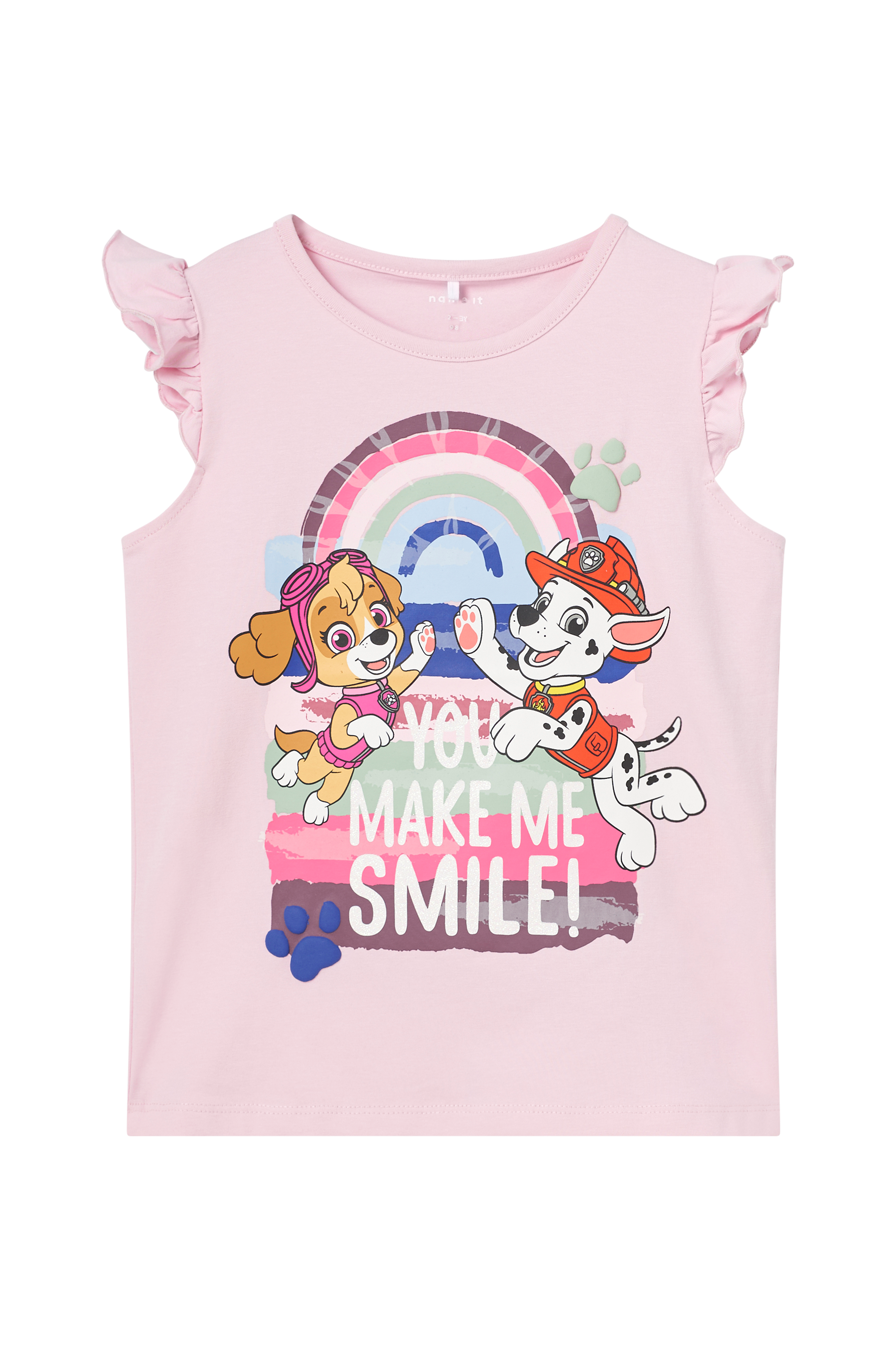 • Laget av myk, stretchy bomull• Rund halsringning• Glitrende trykk foran• Korte volangtermer
