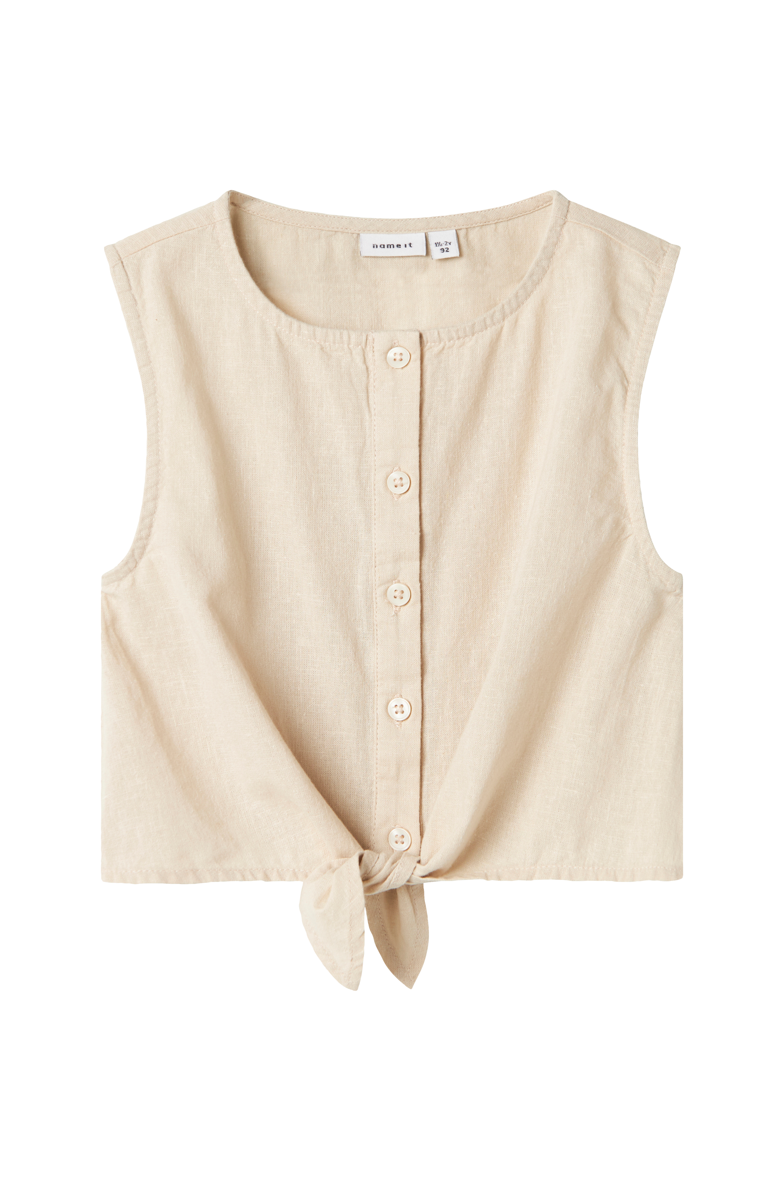 • Ermløs topp i linmiks• Knapper foran• Asymmetrisk hem foran med klaffer• Gummistrikk nedover ryggen