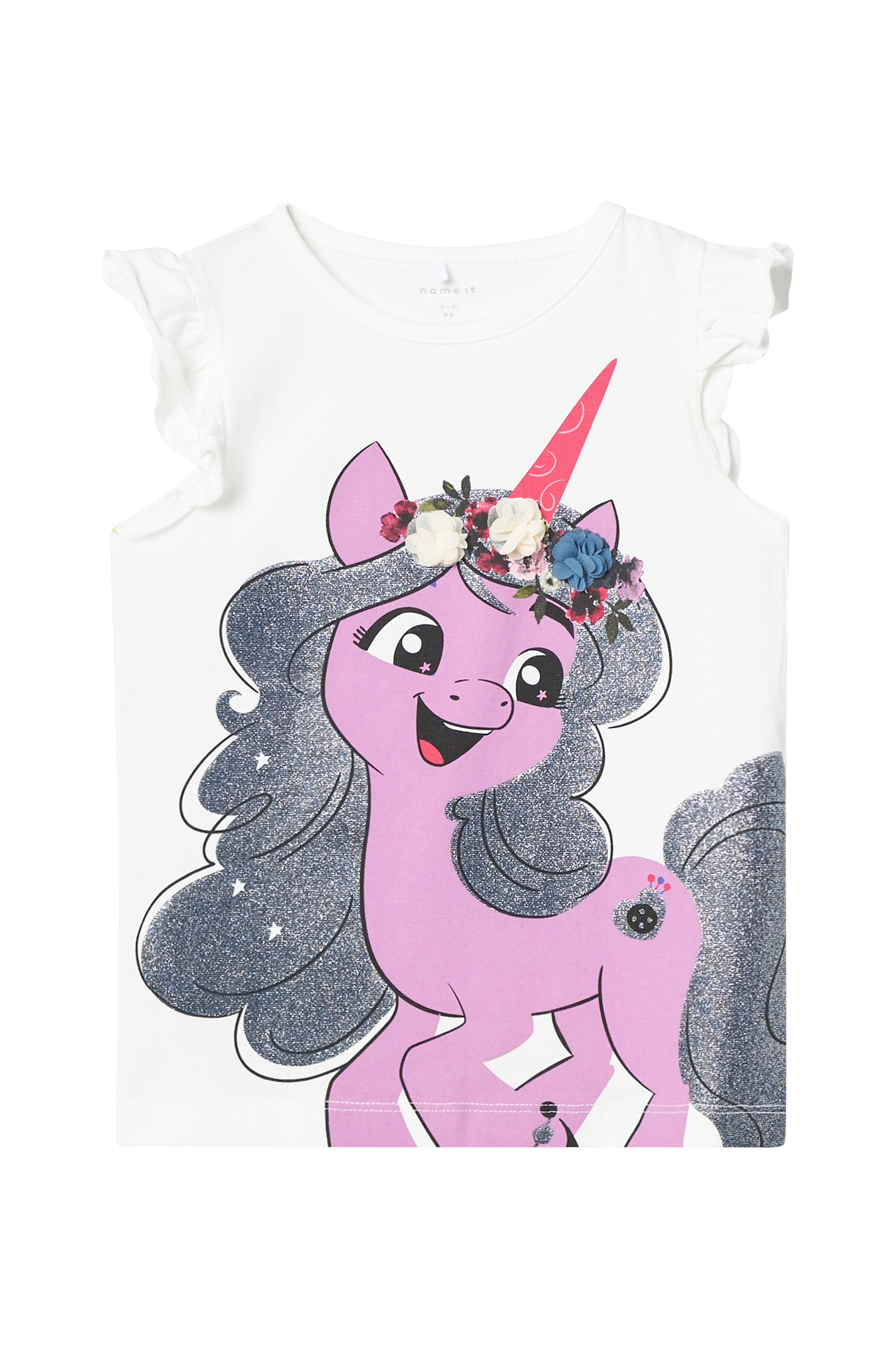 • Ermløs topp med volanger på skuldrene• Glitrende trykk foran• Dekorative blomsterdetaljer i tekstil foran