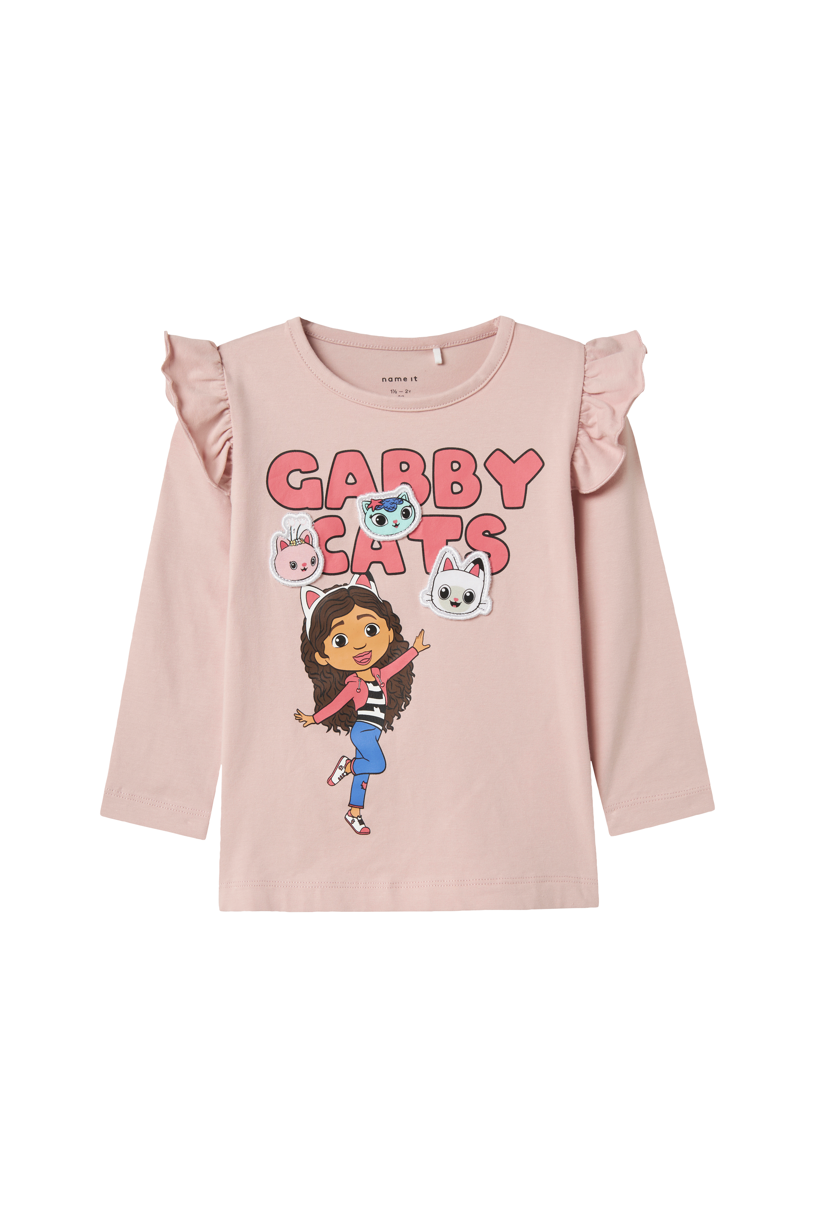 • Topp med lapper og trykk foran• Rund hals• Volang over skuldrene• Lange ermer• Normal passform