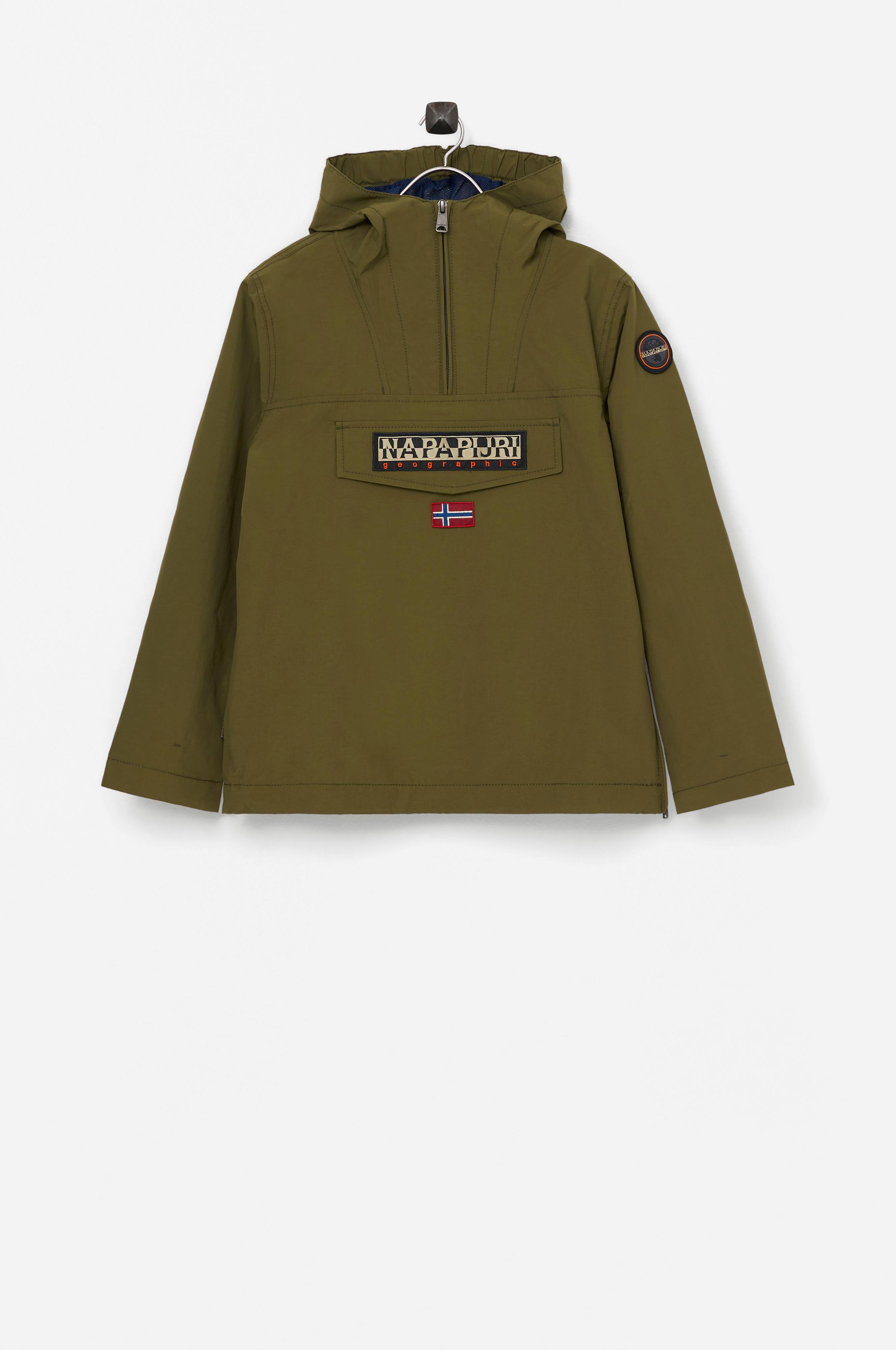 Vind- og vannavvisende anorakk med fôr i ventilerende mesh. Alle sømmer er teipede. Hette med strikk i forkanten. Halvlang glidelås. Magelomme med glidelås og beskyttende lommeklaff som lukkes med borrelås. Ventilerende maljer under ermene. Strikk i ermekantene. Lang glidelås i den ene siden. Snøring med stoppere i nederkanten. Påsydde merker foran og på venstre erme.