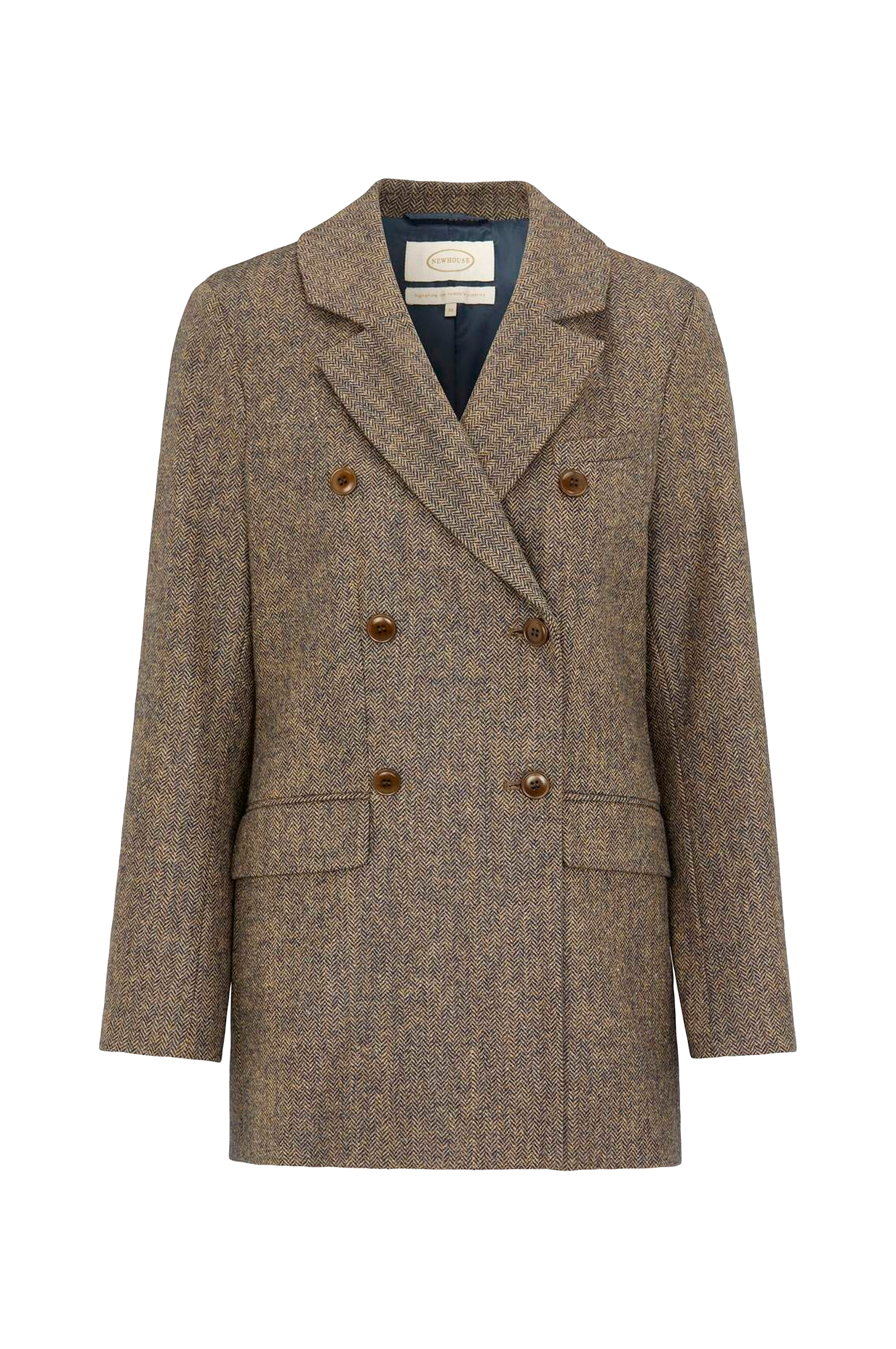 Stilig blazer i dobbeltspent design med knapper. Blazeren er vevd i en fiskebeinsstruktur som kombinerer marineblå og kamelfarget.