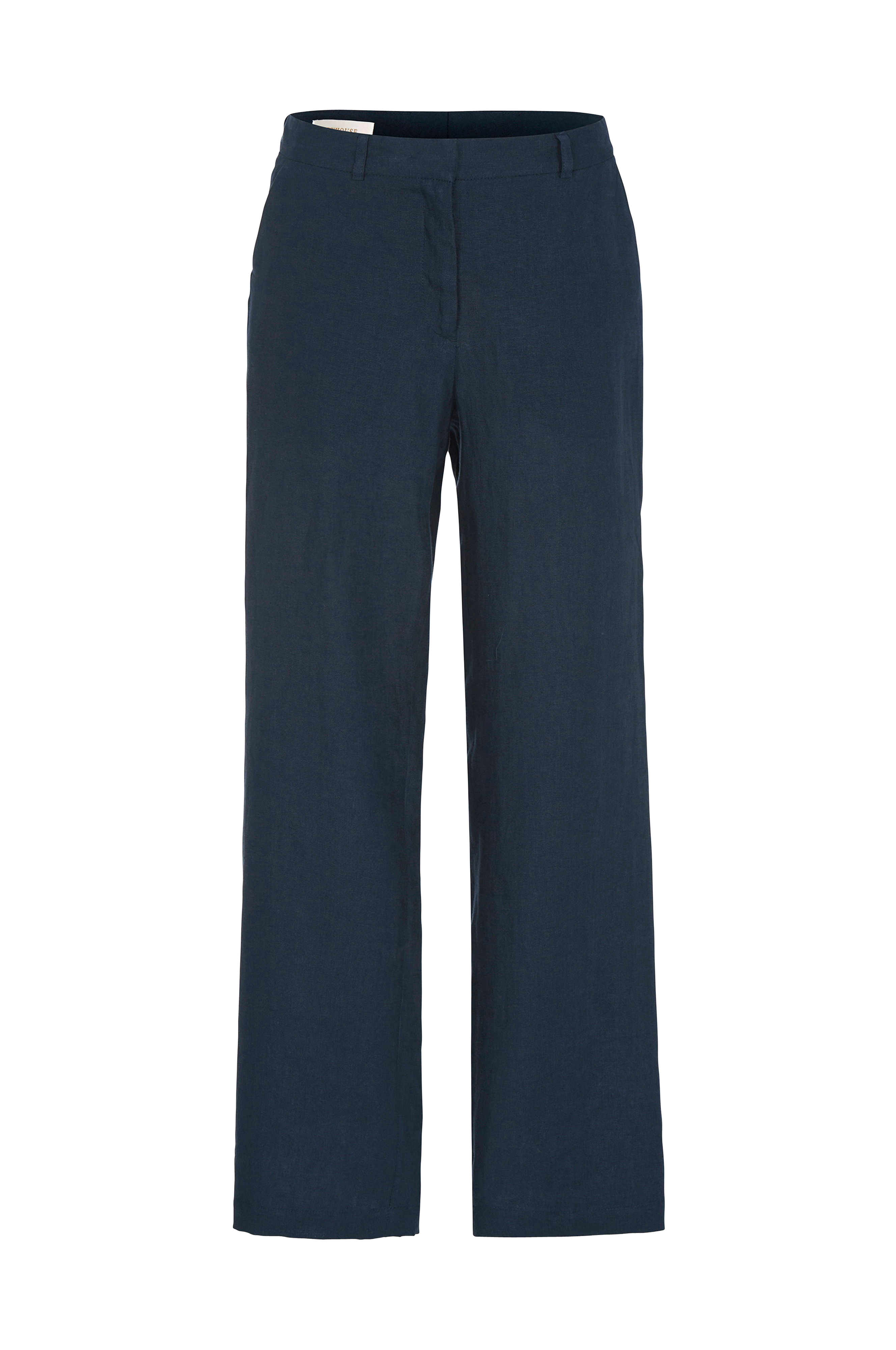 Linbukse i avslappet snitt, med diagonale lommer og beltestropper.