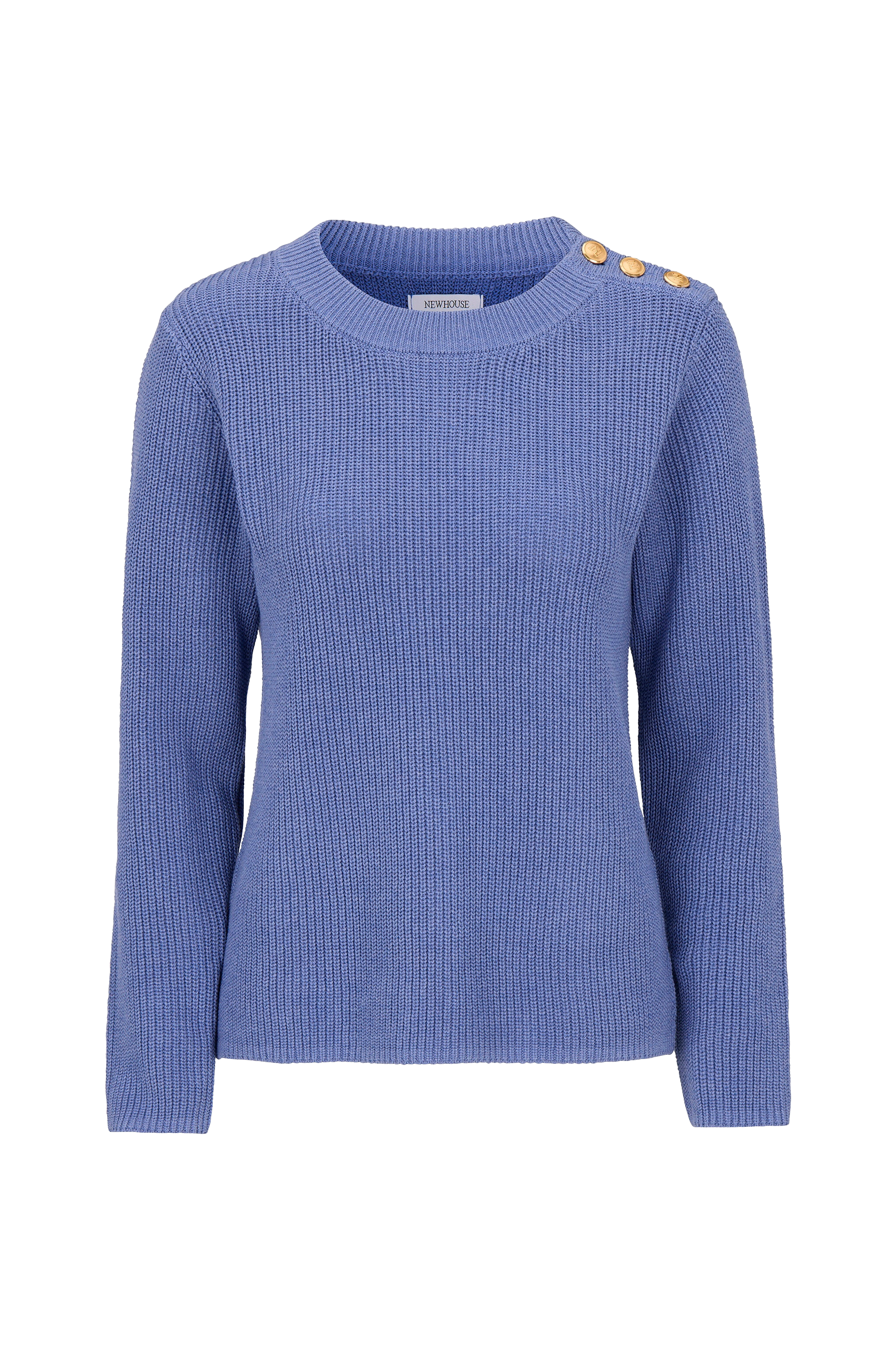 Strikket genser med gullfargede knapper på den ene skulderen og slisser på begge sider.