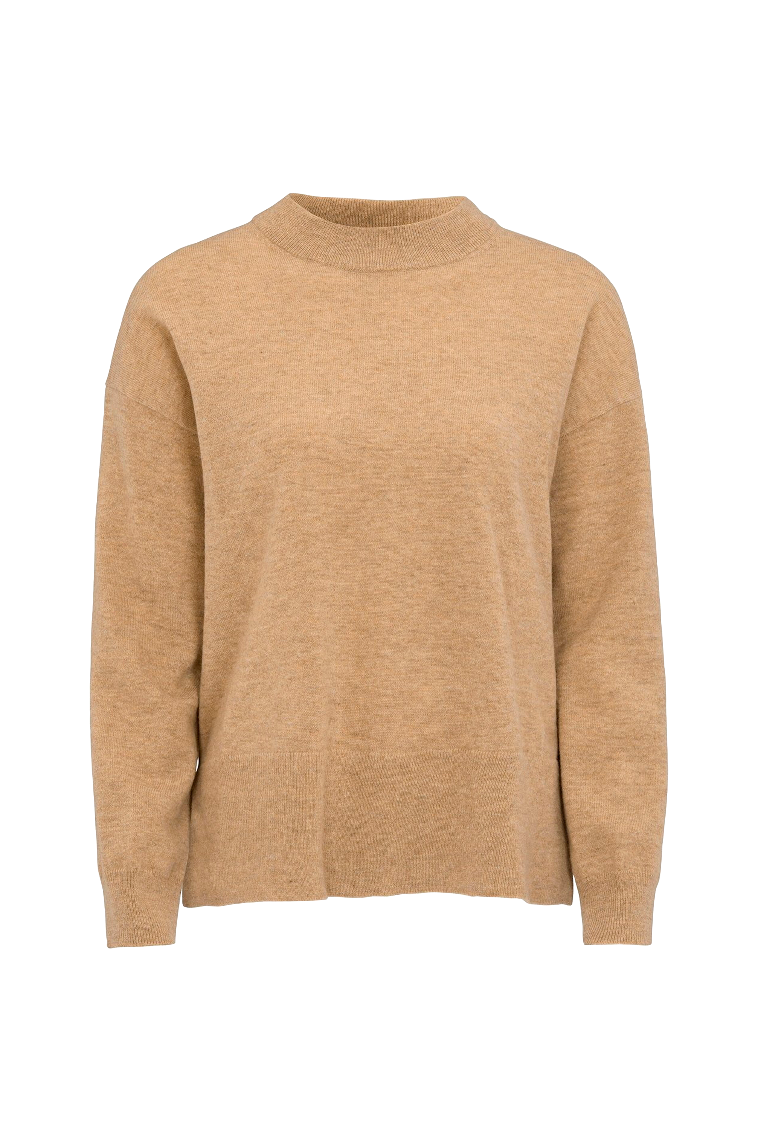 En rundhalset genser i myk lammeull, et tidløst vinterplagg. Genseren i lammeull har en avslappet passform, hengende skuldre og slisser i sidene.