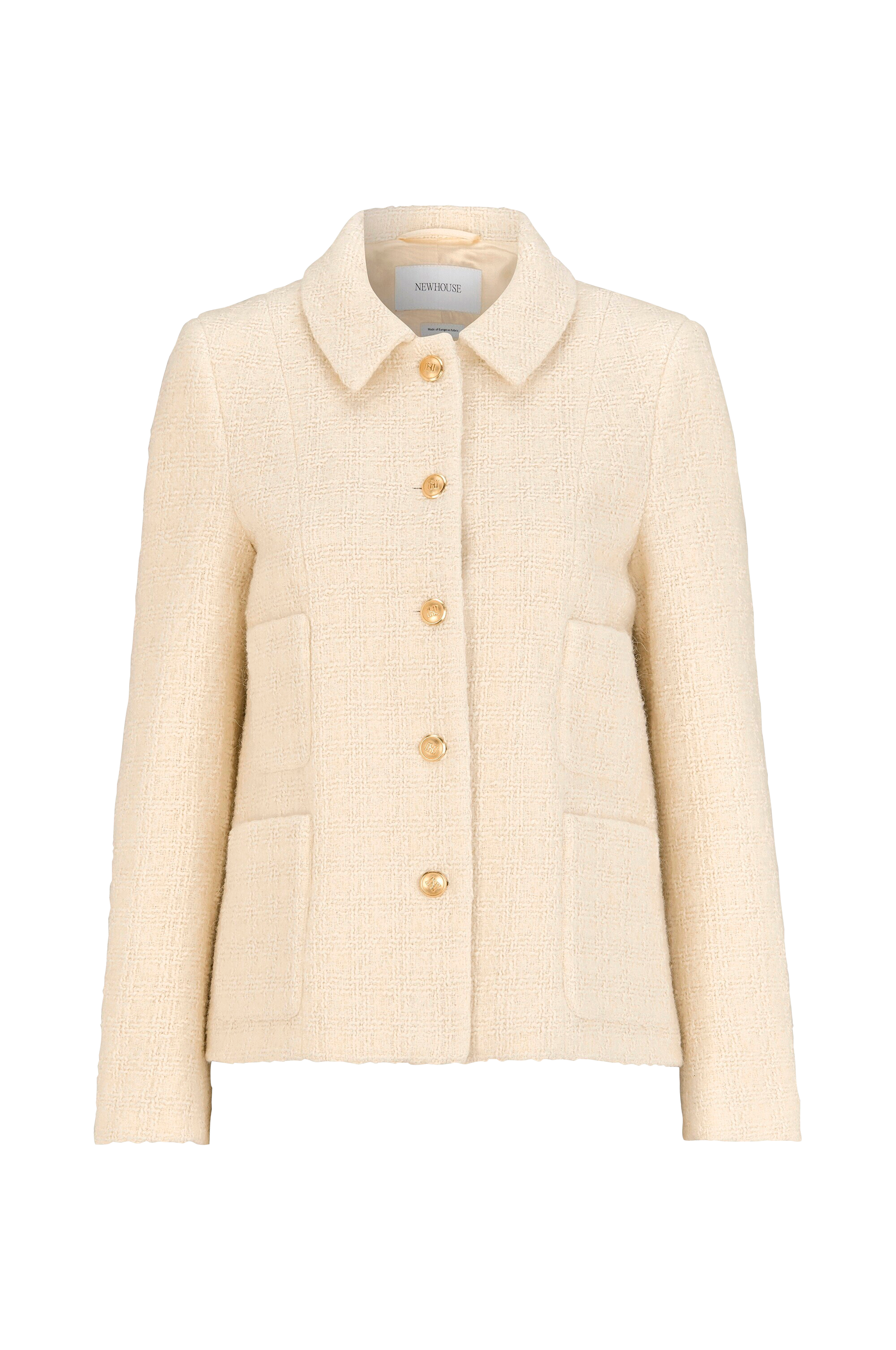 Elegant jakke i snøhvit boucléstoff, helfôret med kremfarget fôr og prydet med gullfargede logoknapper i metall.