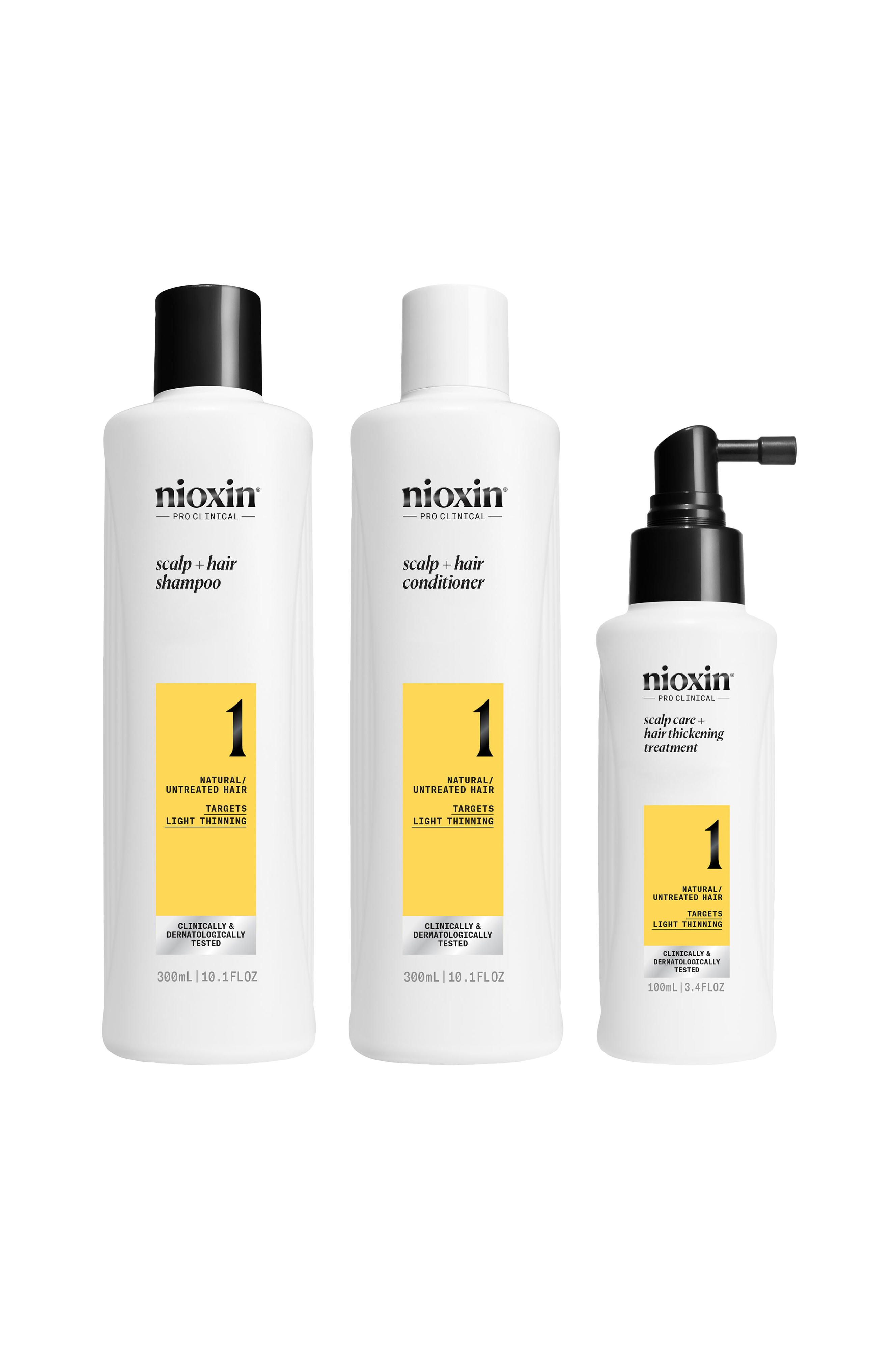 Nioxin System 1 Loyalty Kit er en hårpleie system for naturlig hår med lett uttynning. Dette unike settet med tre profesjonelle hårprodukter, basert på en avansert hudpleiemetode, er spesielt formulert som en hårfortykkende behandling som gir fyldigere hår. Nioxin System 1 reduserer hårfall på grunn av brekkasje, styrker håret og gir naturlig hår en sunn glans, samtidig som hodebunnen friskes opp. Nioxin Cleanser Shampoo fjerner smuss, talg og andre rester fra miljøet fra hodebunnen og håret. Nioxin Scalp Therapy Conditioner er en lett balsam som bidrar til å gi håret spenst, samtidig som den fukter hodebunnen og håret fra rot til spiss. Nioxin Scalp & Hair Treatment frisker opp hodebunnen og bidrar til å gi tykkere hår ved å øke fylden i hvert hårstrå. Det er klinisk bevist at kit reduserer hårfall på grunn av brudd med opptil 91 %**.