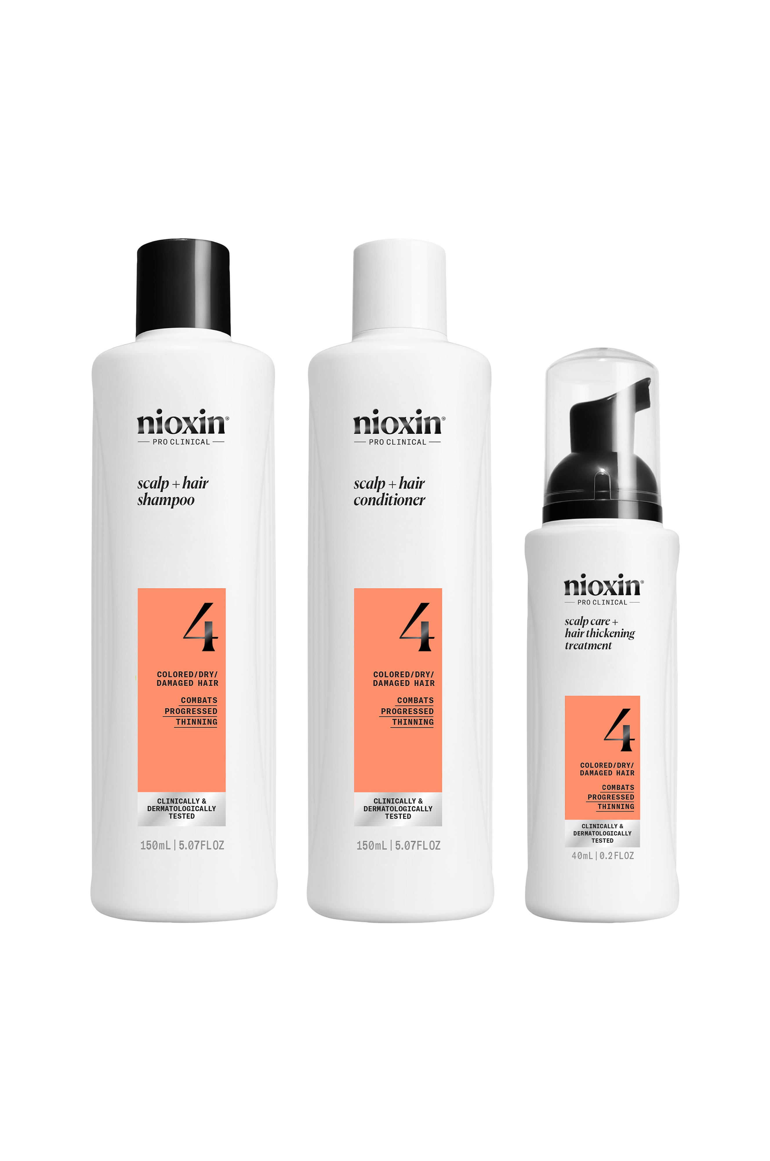 Nioxin System 4 Trial Kit er en hårpleie system for farget, tørt og skadet hår med fremskreden uttynning. Dette unike settet med tre profesjonelle hårprodukter, basert på en avansert hudpleiemetode, er spesielt formulert som en hårfortykkende behandling som gir fyldigere hår og fargebeskyttelse. Nioxin System 4 reduserer hårfall på grunn av brekkasje, styrker håret og gir fargebehandlet hår en sunn glans, samtidig som hodebunnen friskes opp. Nioxin Cleanser Shampoo fjerner smuss, overflødig olje og andre rester fra miljøet fra hodebunnen og håret. Nioxin Scalp Therapy Conditioner er en lett balsam som bidrar til å gi håret spenst, samtidig som den gir fuktighet til hodebunnen og håret fra rot til topp. Nioxin Scalp & Hair Treatment frisker opp hodebunnen og bidrar til å gi tykkere hår ved å øke fylden i hvert hårstrå. Den nye Nioxin System 4 Trial Kit er en kombinasjon av den gamle Nioxin System 6 Kit og Nioxin System 4 kit. Den nye System Kit 4 er egnet for tørt, skadet og farget hår og er rettet mot fremskreden uttynning. Hvis du tidligere elsket Kit 6, vil du elske den nye Kit 4. Det er klinisk bevist at kit reduserer hårfall på grunn av brudd med opptil 91 %**.