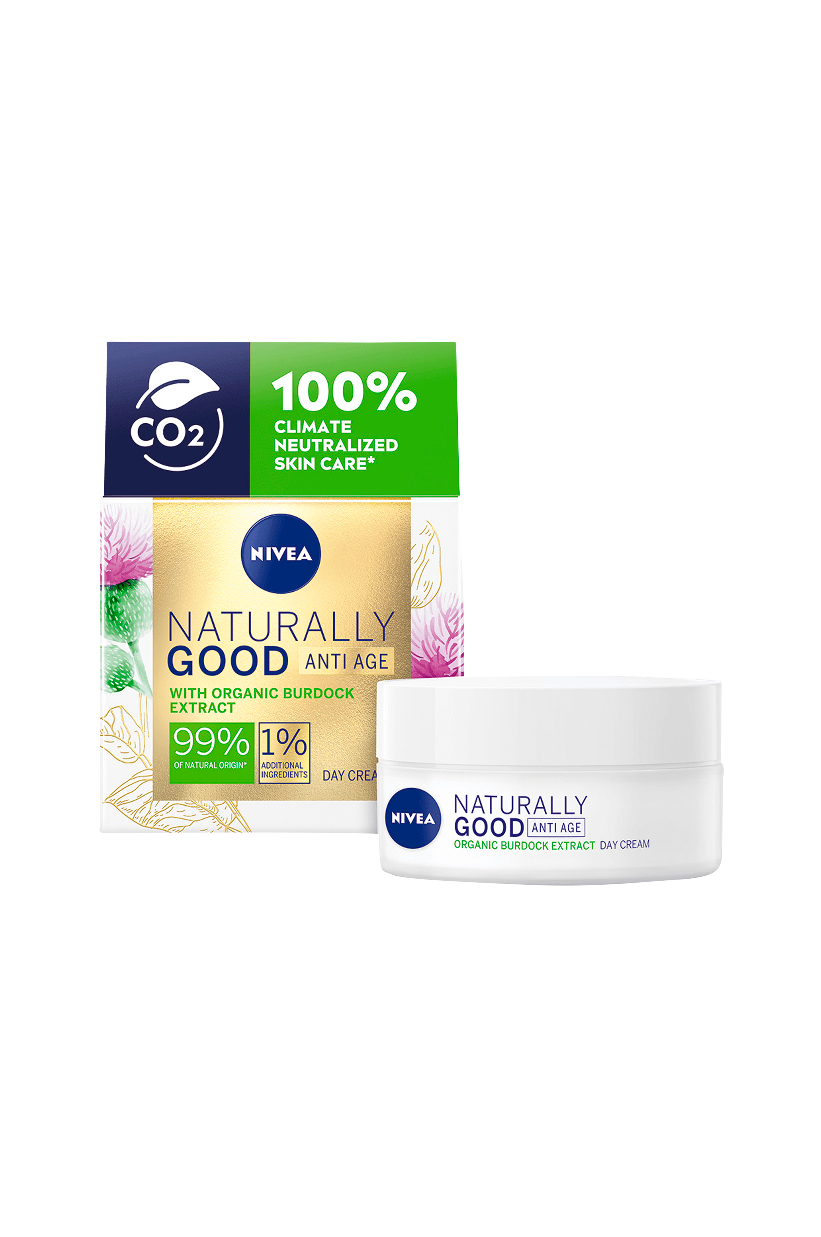 Nivea Natural Good Anti-Age Day Cream reduserer synligheten av linjer og rynker på bare to uker, og med økologisk borreekstrakt blir huden fast og myk. 99% av ingrediensene har naturlig opprinnelse*. Økologisk borreekstrakt stimulerer hudens egen kollagenproduksjon**.