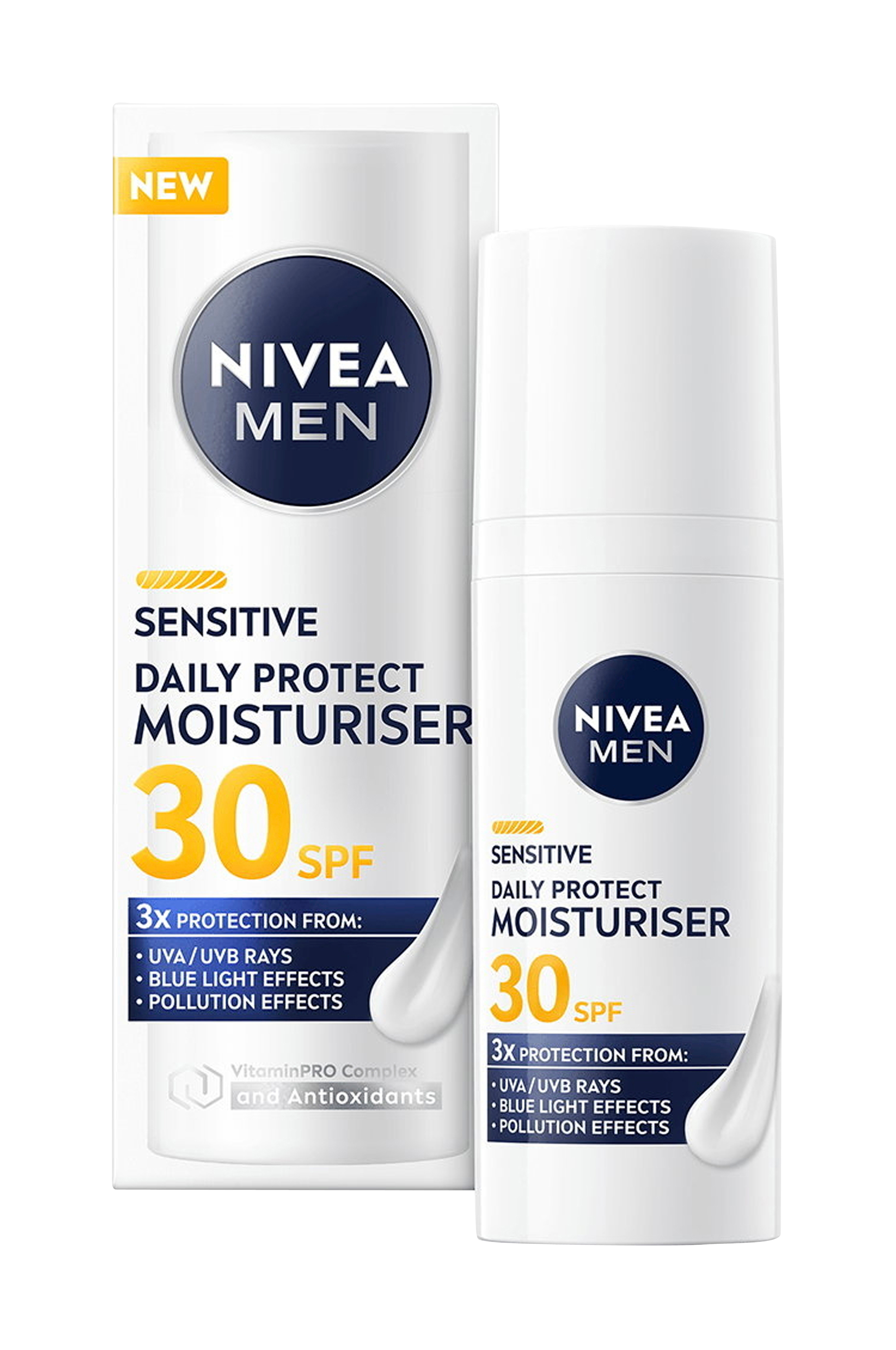 Nivea Men Sensitive Daily Protect Moisturiser gir avansert pleie for sensitiv hud med en trippel beskyttelsesformel. Denne lette og hurtigabsorberende fuktighetskremen er beriket med VitaminPro Complex (vitamin E og provitamin B5) og antioksidanter, og beskytter huden din mot Uva/Uvb stråler, blått lys og forurensning. Den ikke-fete formelen gir en umiddelbar fuktboost og etterlater huden fuktig og frisk hele dagen. Den er spesielt utviklet for sensitiv hud, er dermatologisk godkjent og kan også brukes etter barbering for ekstra beskyttelse. Påføres daglig på rengjort ansikt og hals for en sterkere og mer spenstig hud med langvarig komfort.
