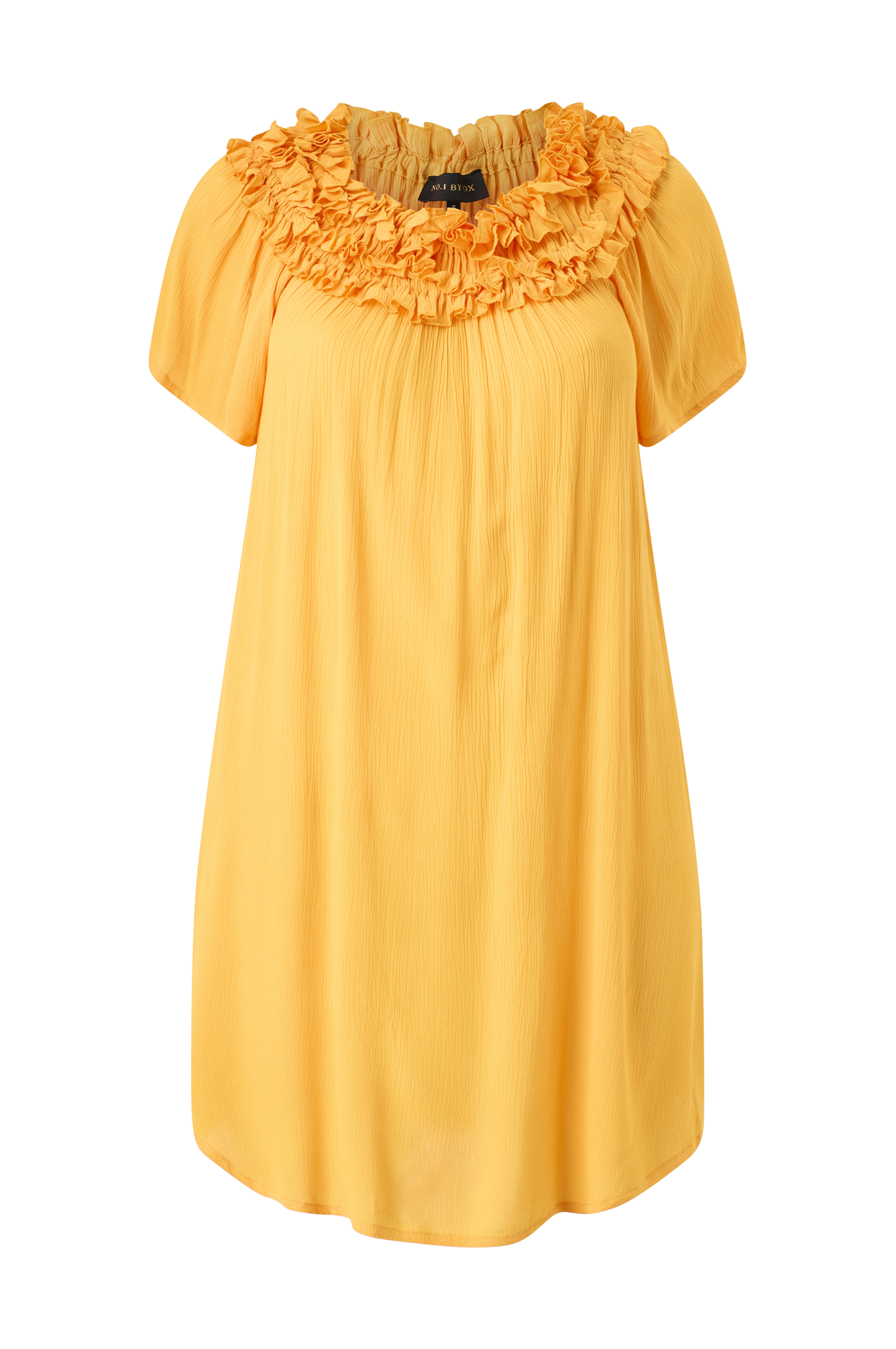 • Kjole i rynket viskose• Bred, elastisk hals med volanger• Korte ermer• Lengde: 97 cm i størrelse S• Pluss-størrelser
