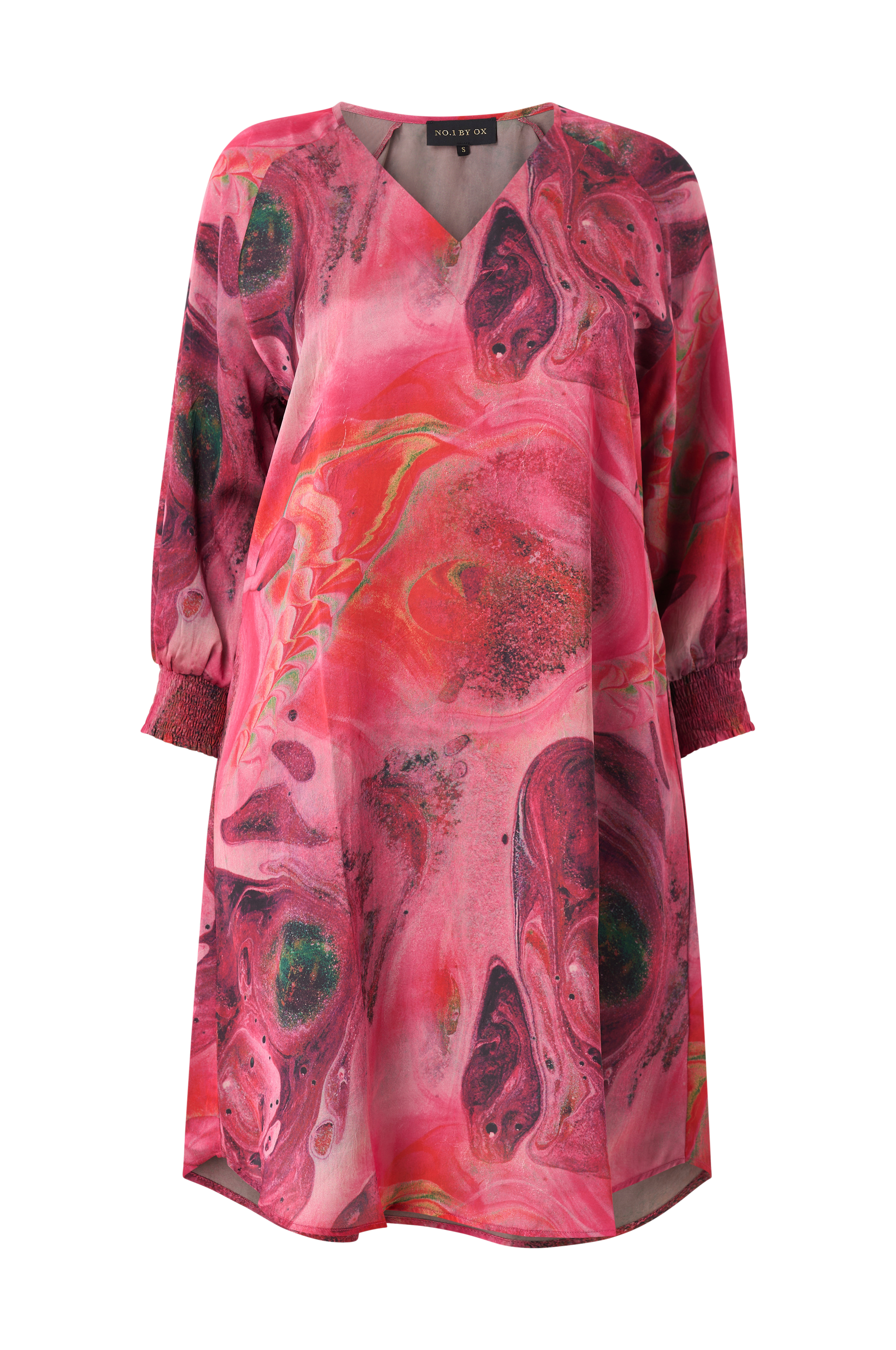• Mønstret kjole i sateng med løs passform• V-formet hals• Lange ermer med vaffelsøm i ermeslutten• Avrundet hem• Pluss-størrelser• Lengde: 112 cm i størrelse S