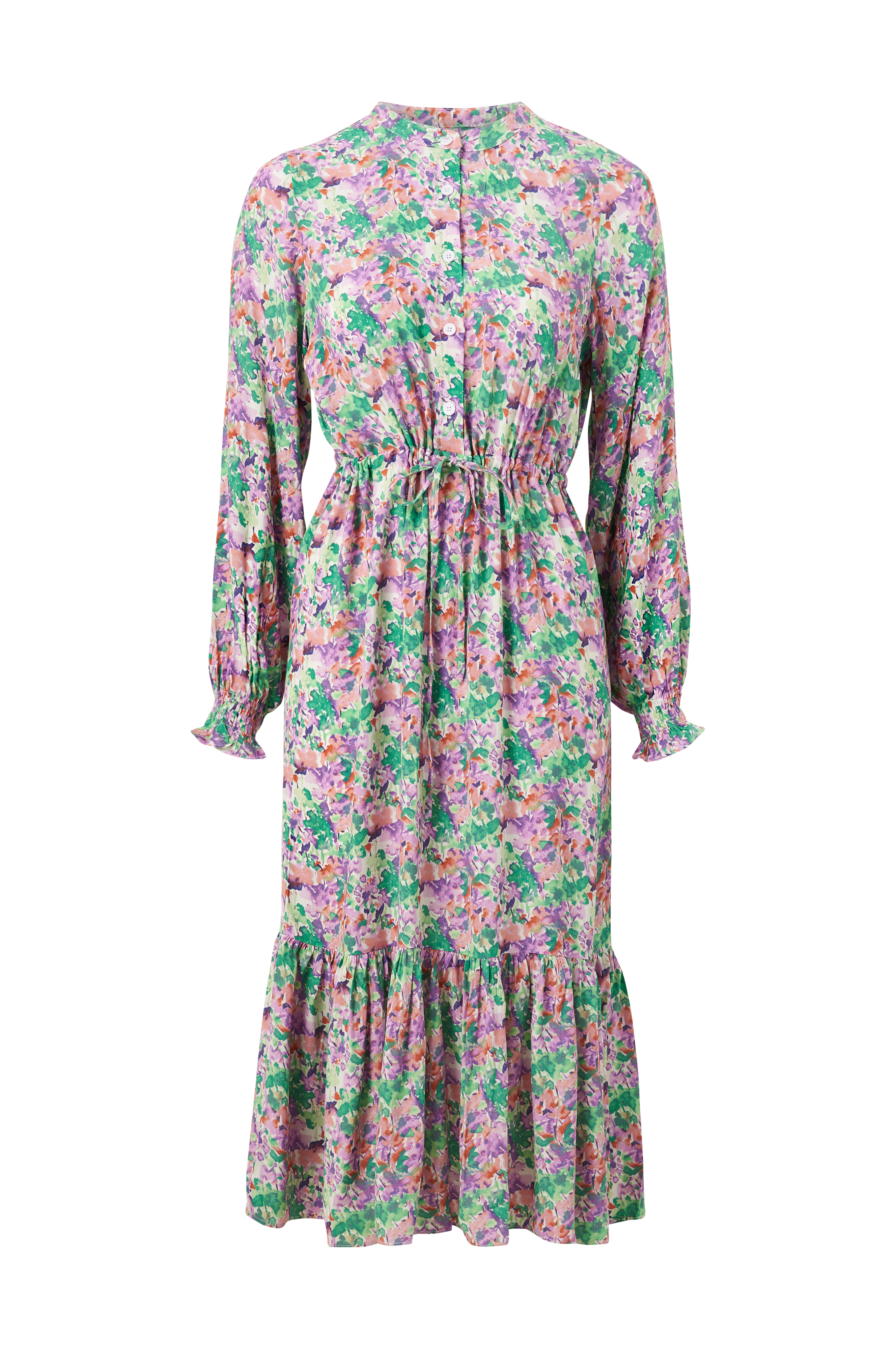 • Midikjole i viskose• Knapper oppover foran• Snøring ved midjen• Lange ermer med vaffelsøm i ermeslutten• Volang på bunnen• Lengde: 120 cm i størrelse S