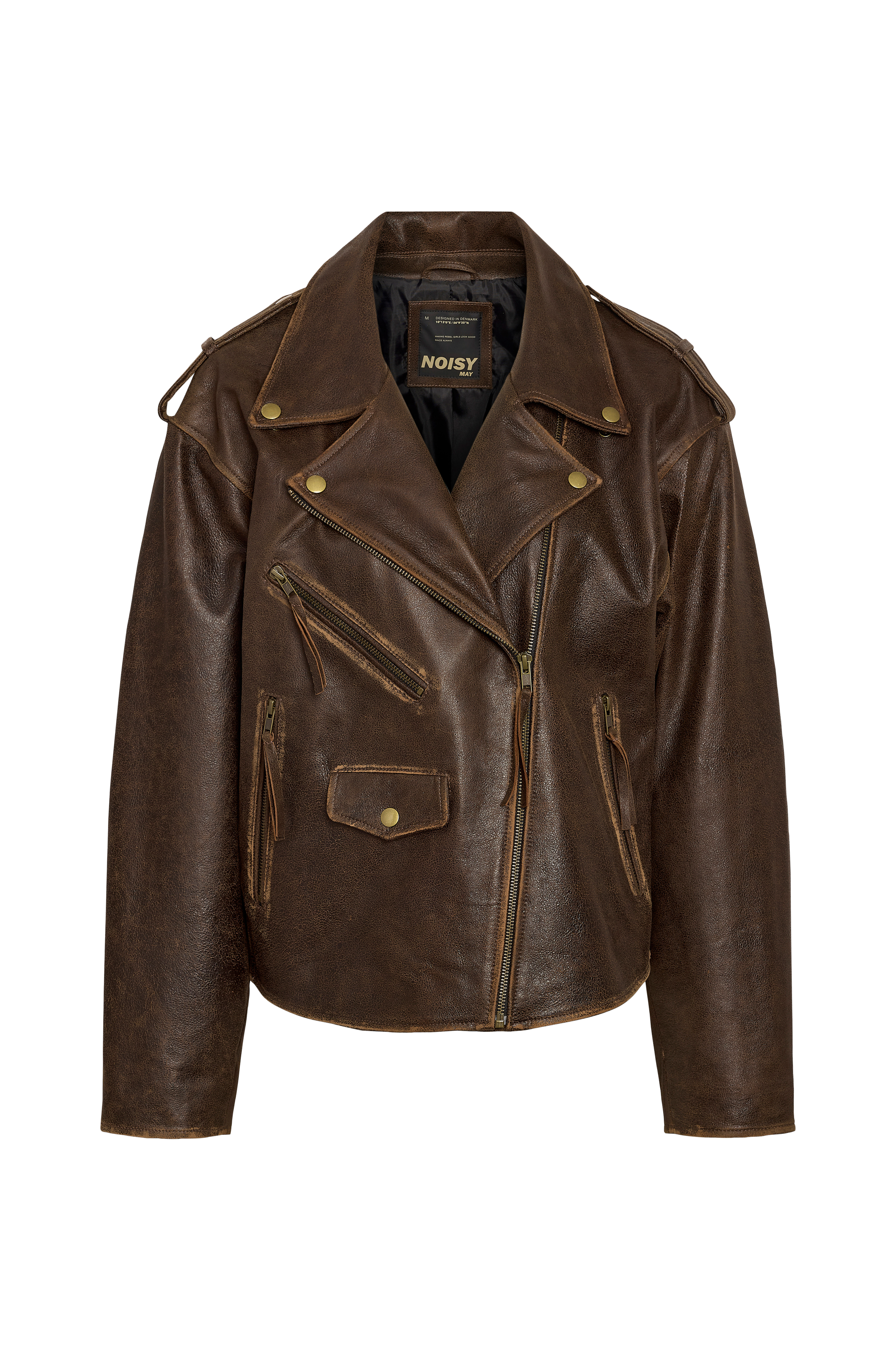 • Biker jakke i skinn• Krage med trykknapper• Glidelåslukking• Tekstilfôr• Glidelåser ved armenden• Tre glidelåslommer• En lomme med lokk• Løs passform• Lengde: 59 cm i størrelse S