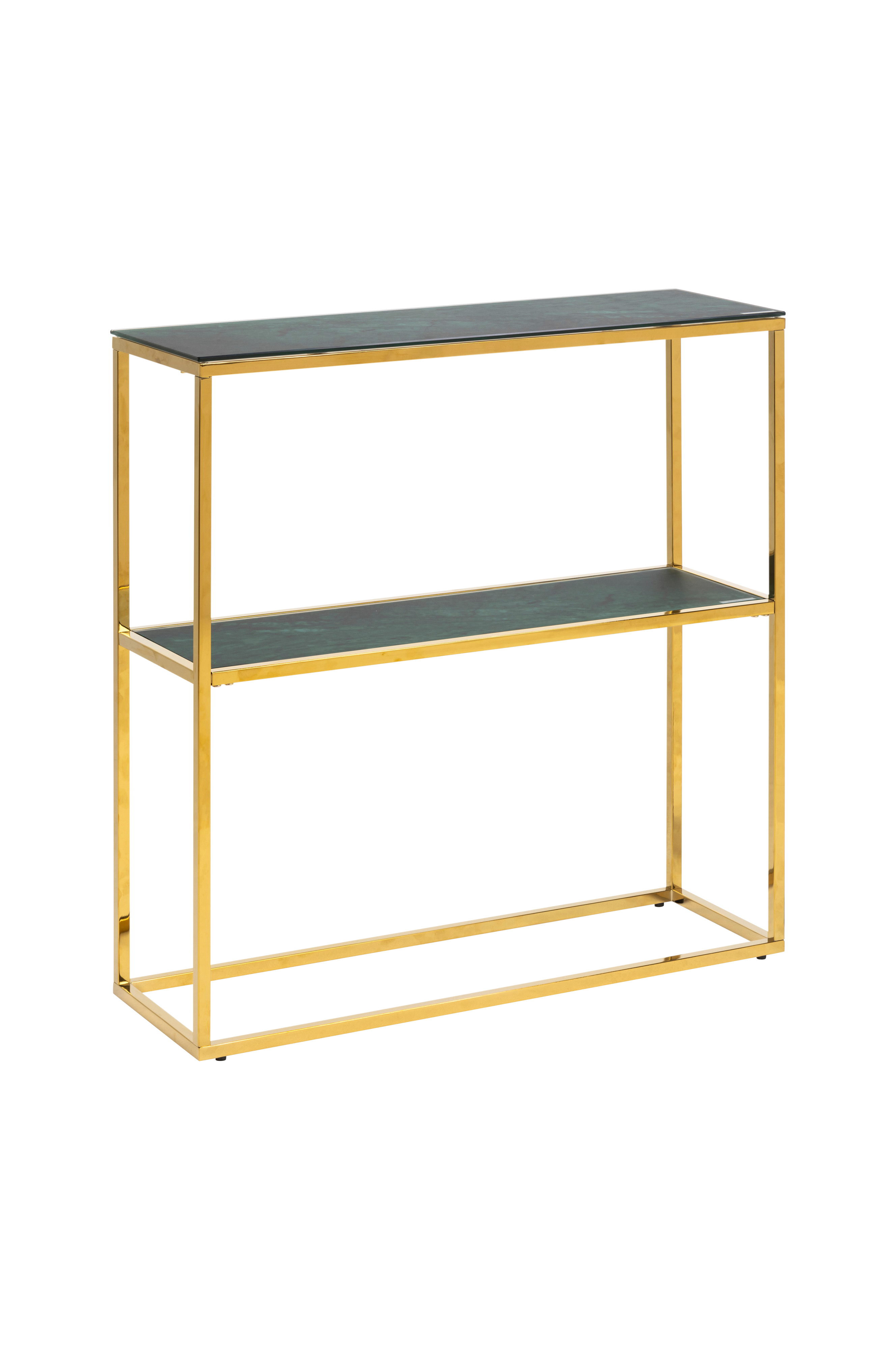 Dette glamorøse avlastningsbordet er både moderne og kraftfullt. En eksklusiv kombinasjonen av gyllent krom og frostet grønt glass med marmorpreg, et avlastningsbordet som tilfører hjemmet et luksuriøst preg. Plasser avlastningsbordet i gangen eller stuen, pynt det som du vil og skap din egen spesielle stil. Leveres umontert.