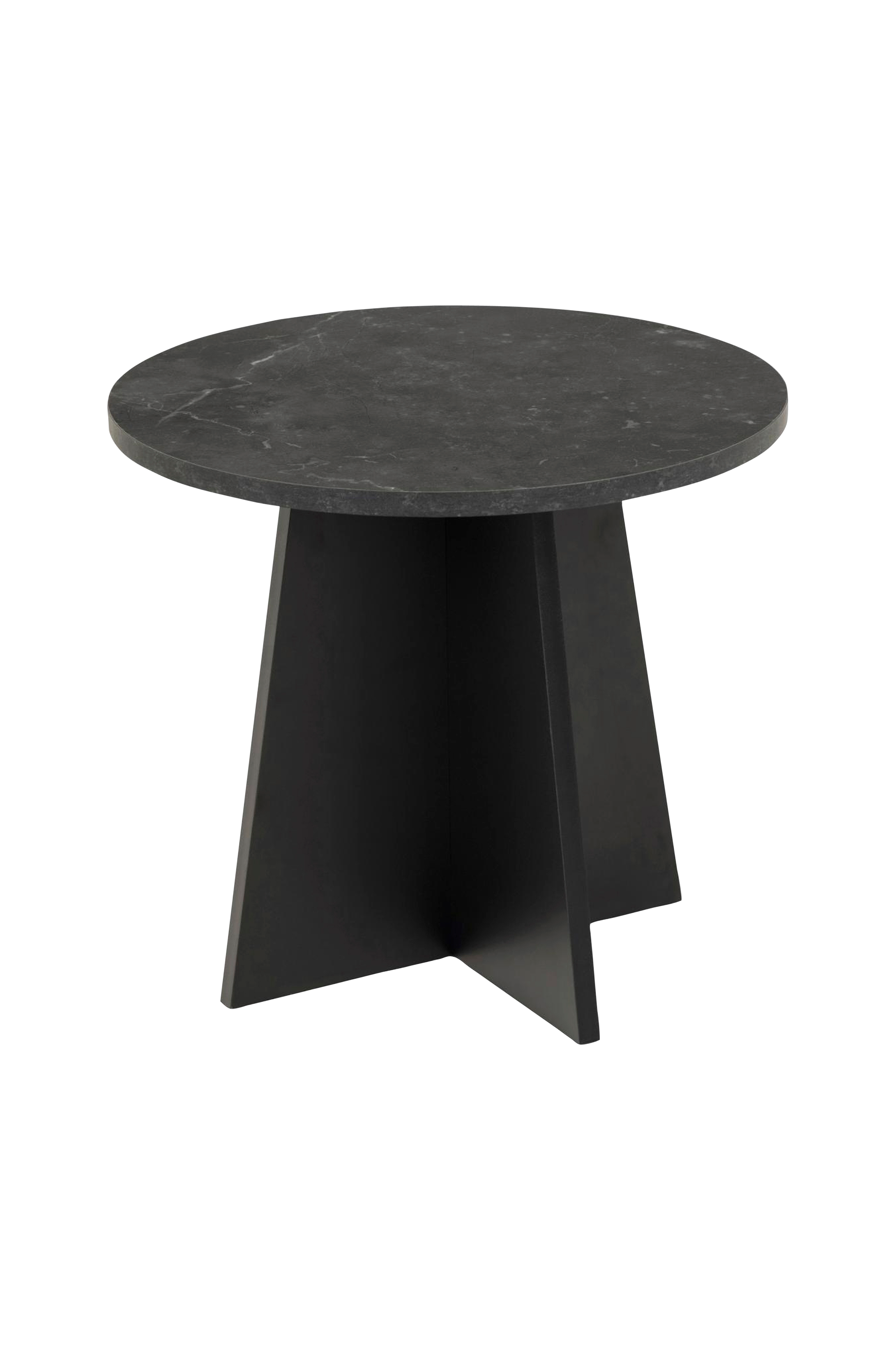 Sidebord med firkantet, vinklet stamme og rund bordplate, som kombinerer form og silhuett for å skape et moderne, estetisk møbel som imponerer i hjemmet. Bordplaten ligner marmor og er produsert av melamin, noe som gir bordet en imponerende stil. Sidebord med eksklusive designrettigheter, designet av vår egen designer Lasse Cha Pedersen.
