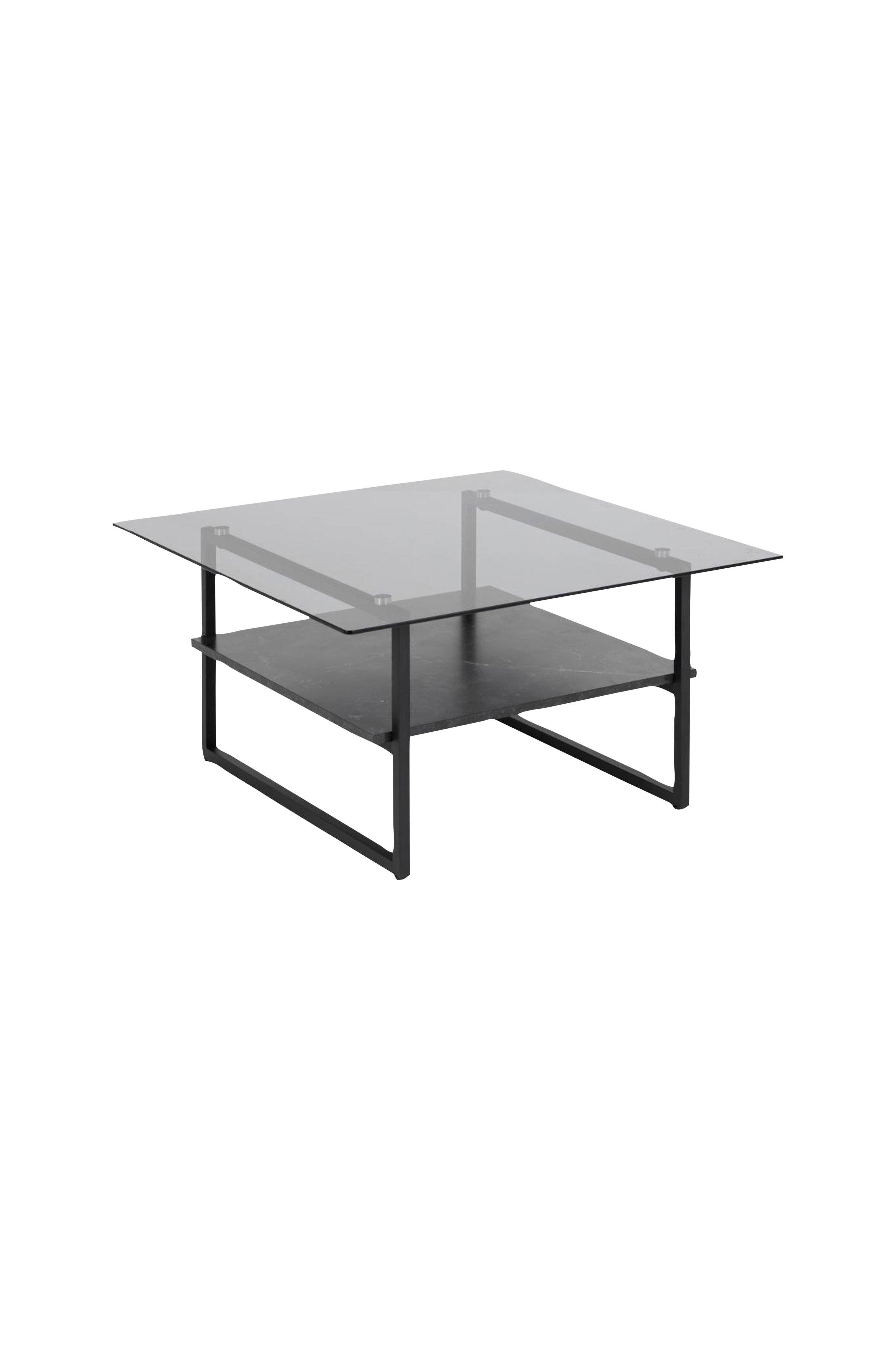Gi stua litt eleganse med dette sofabordet. Bordplaten er produsert av røykfarget, malt glass som gir bordet en lett og moderne følelse. Hyllen som ligner svart marmor gir oppbevaringsplass til bøker og magasiner. Den pulverlakkerte metallstammen sammenfører marmorfinish og glass, og gir en stil som passer i alle moderne hjem. Leveres umontert.
