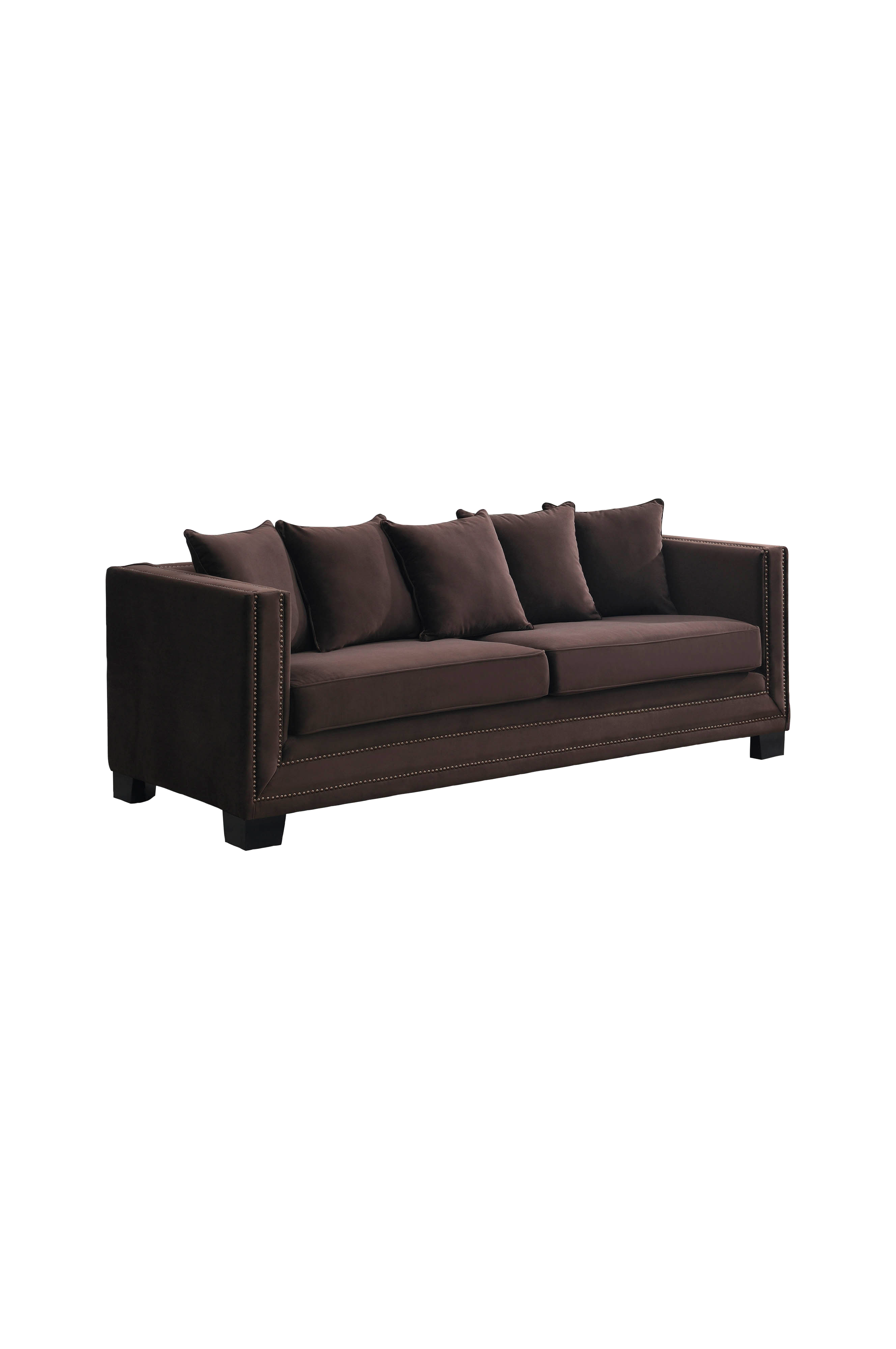 Sofa i velur med bronsefargede dekorspikre. Lakkerte ben i tre. 5 puter inkludert.