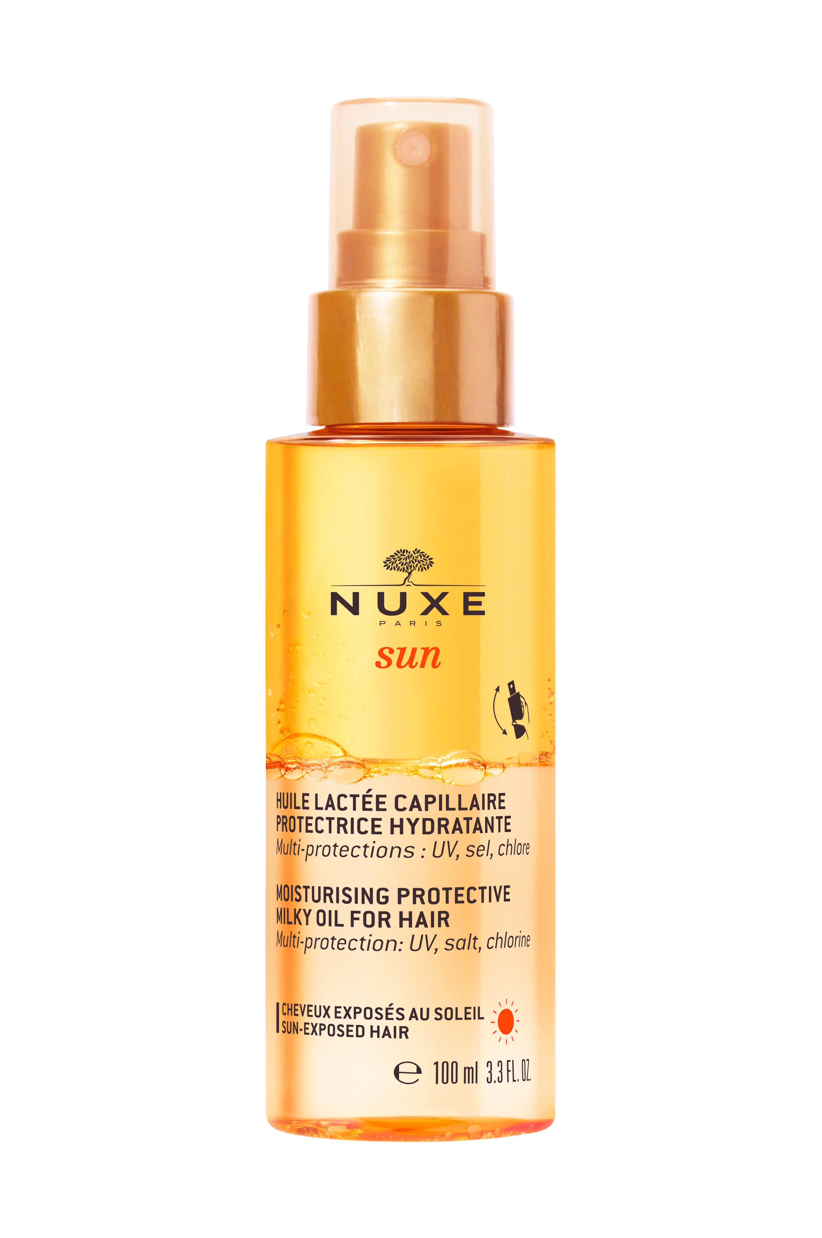 Sun Moisturising Protective Milky Oil for Hair er en hårolje som beskytter håret mot solens UV-stråler, samt gir fukt og glans. Beskytter både hår og hårfarge mot klor- og saltvannets negative effekter på håret. Misten gir en ultralett og ikke-fet finish som gjør håret fuktet og silkemykt uten å tynge. Søt appelsin, tiareblomst og vanilje gir en uimotståelig sommerlig duft. Inneholder 87% ingredienser av naturlig opprinnelse.