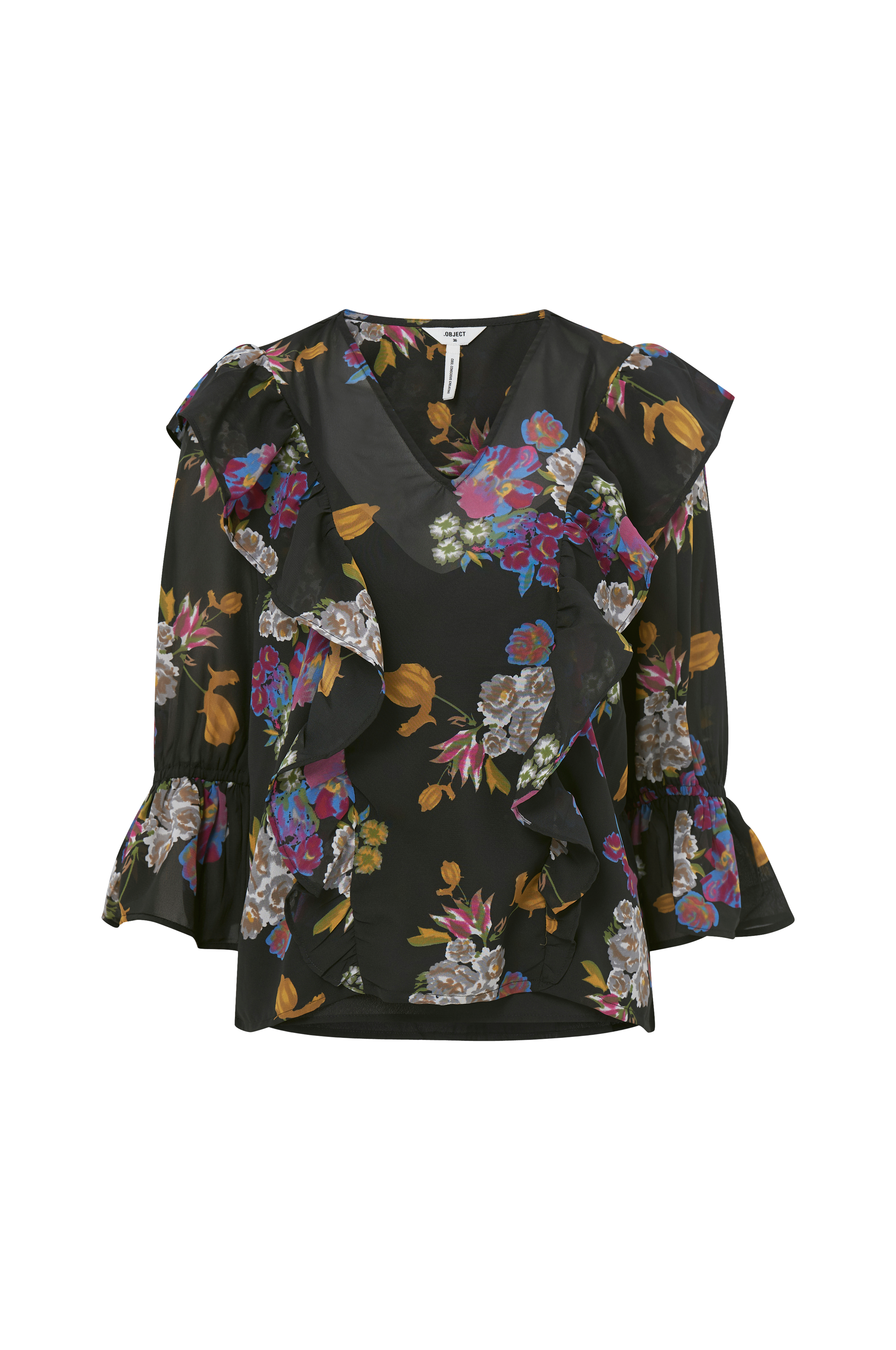 • V-hals• Armer 3/4 lang med volang i ermeslutten• Volang på skuldrene• Laget av chiffon• Fôret