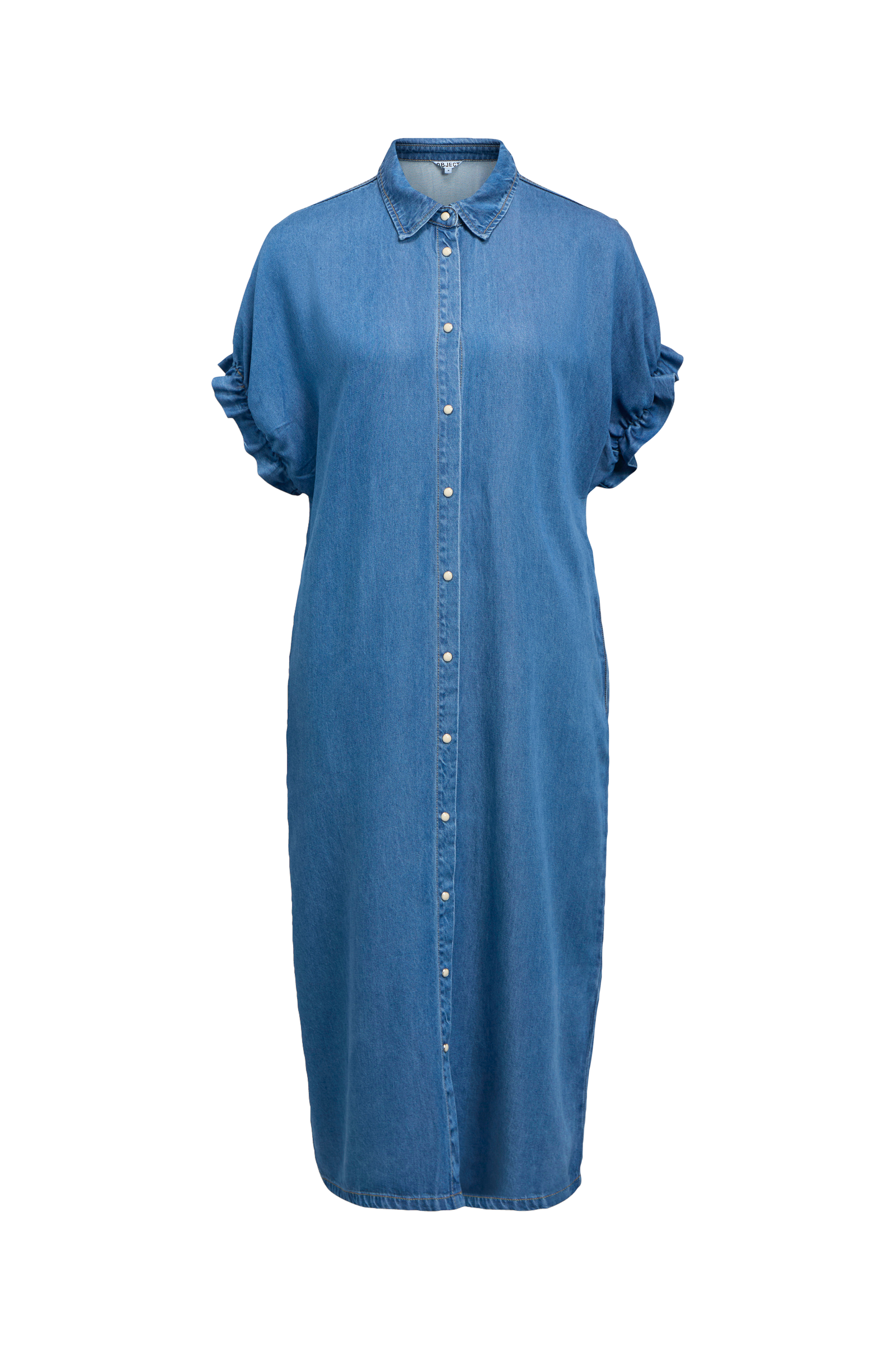 • Lang denimkjole med krage• Rett modell med trykknapper hele veien fram• Korte ermer med elastiske volanger i ermeslutten• Sidelommer• Lengde: 120 cm i størrelse S