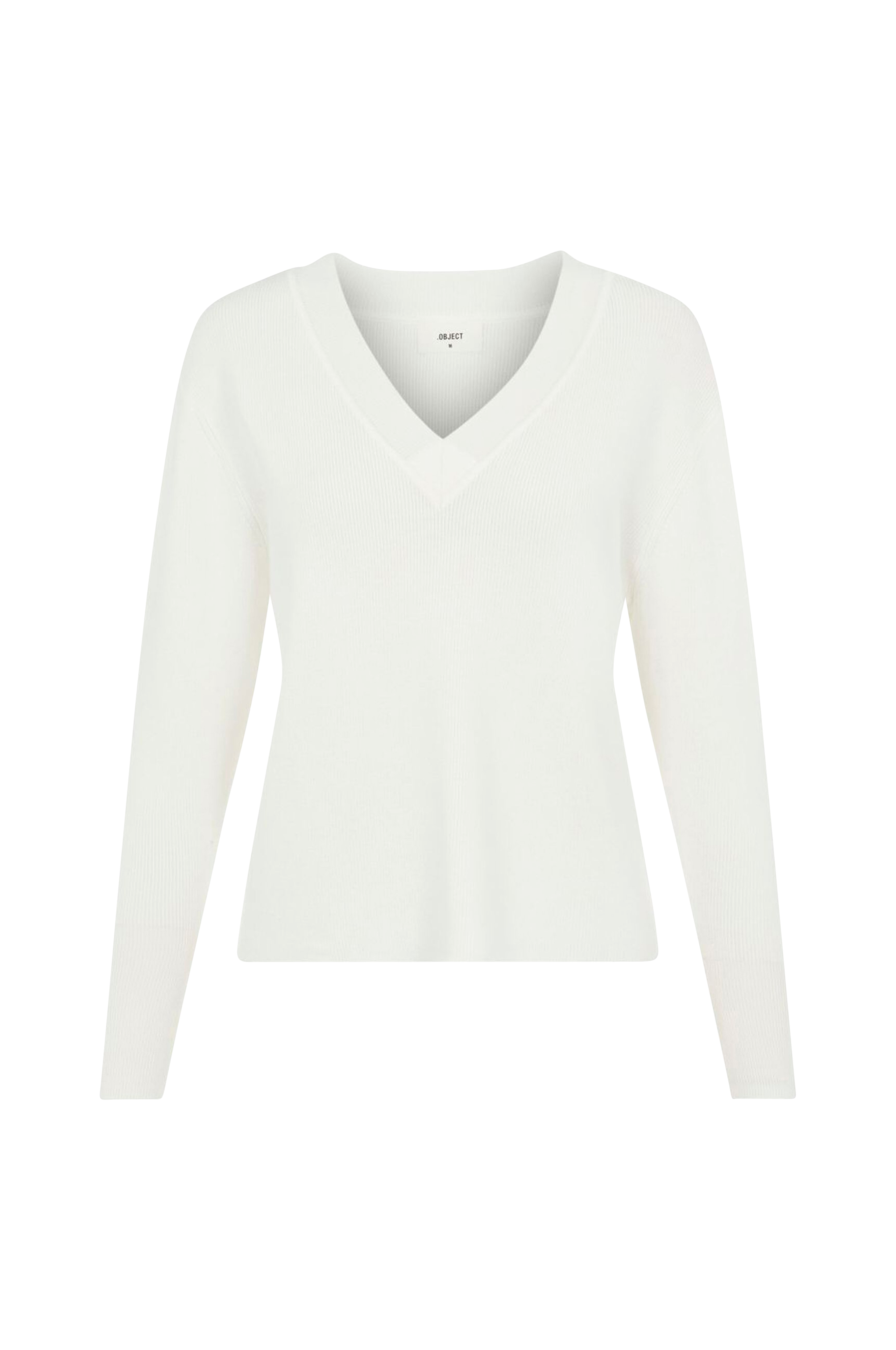 Ribbestrikket genser med V-hals og smal vrangbord i ermekantene. Noe lengre bak.