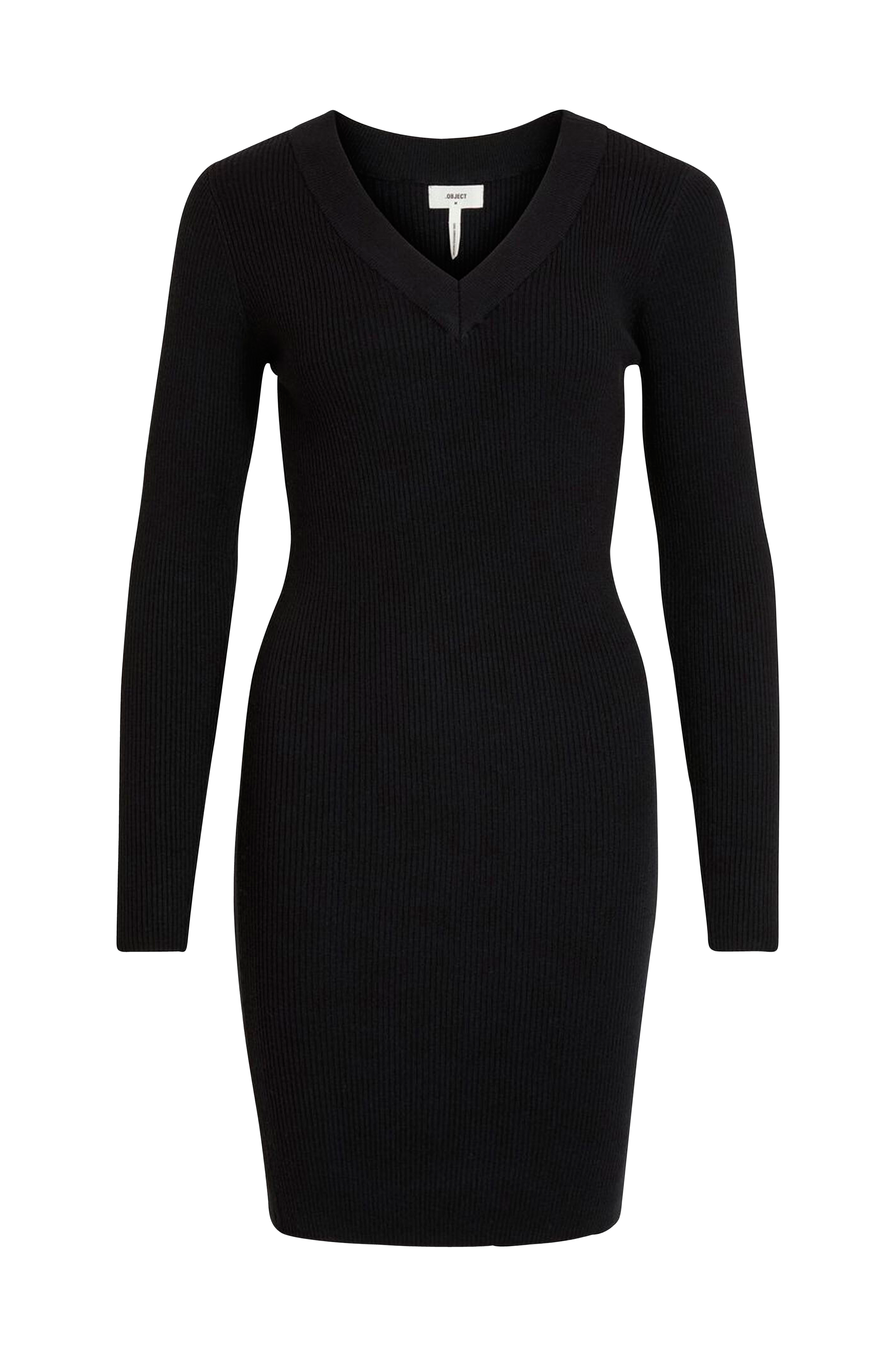 Kjole objFae Thess L/S Rib Knit Dress fra Object i smal, figurnær modell med lange ermer og ribbestrikket V-utringning. Laget av en myk, ribbestrikket kvalitet. Lengde ca. 92 cm i str. S.