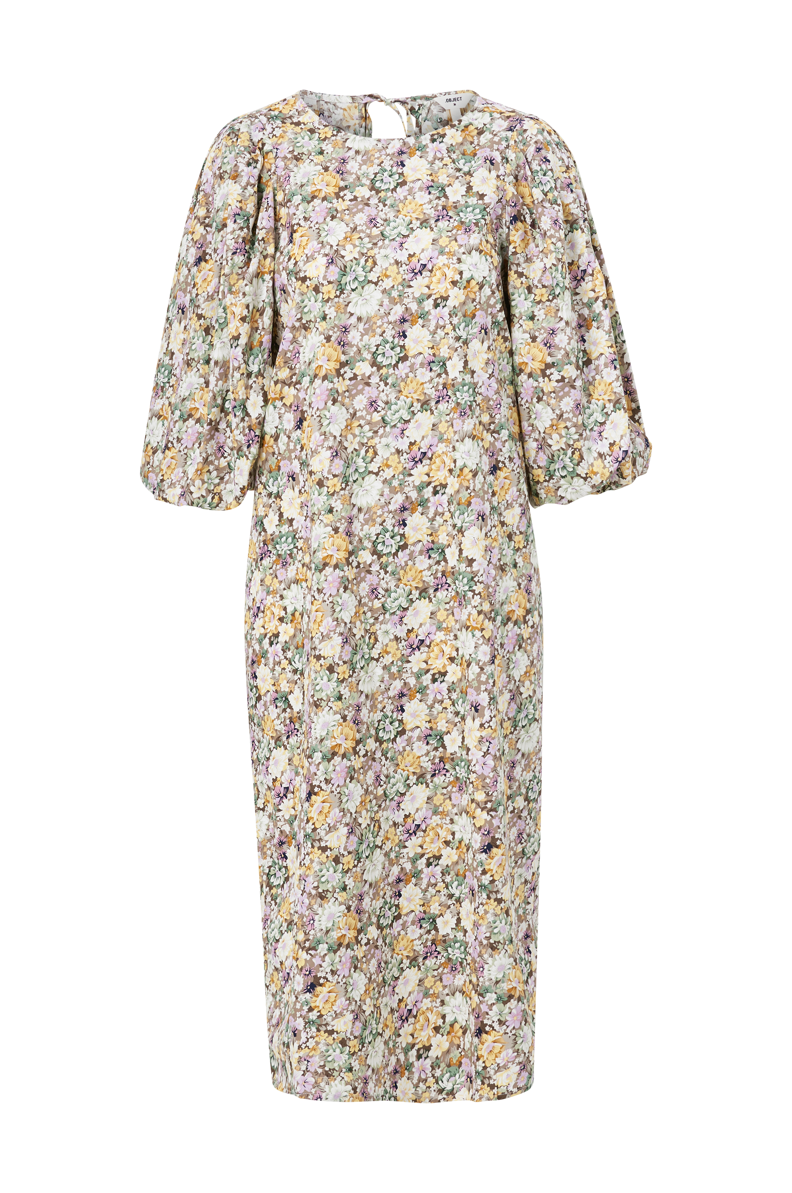 Kjole i rett modell med ledig form og rund hals med smal kant og splitt med knyting i nakken. Halvlange, vide puffermer med lagte legg ved skuldrene og innvendig strikk i ermekantene. Lengde ca. 117 cm i str 36.