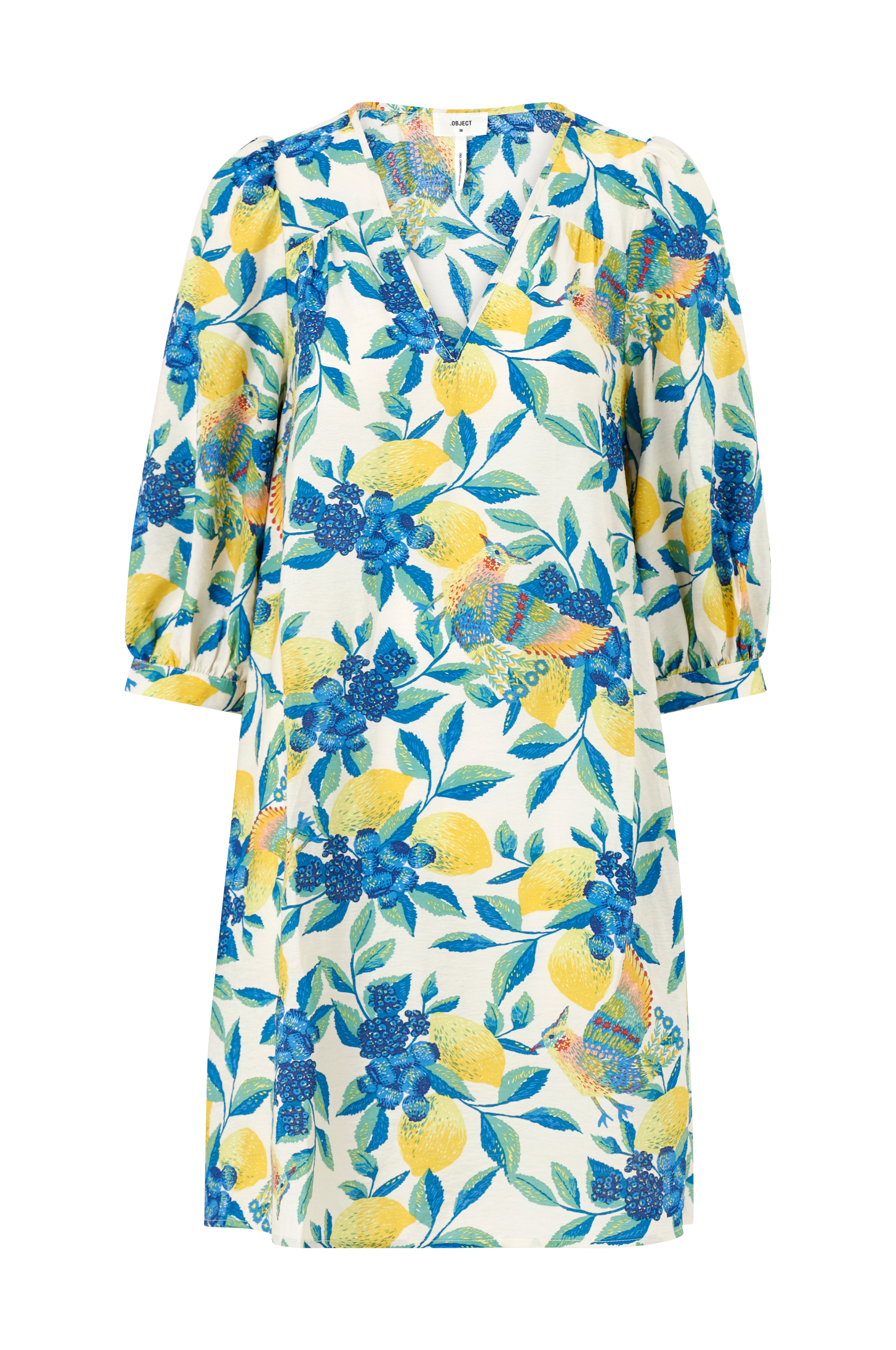 Kjole i vevd kvalitet med lett tekstur. V-utringet hals og 3/4-lange ermer med liten puff. Lengde ca. 96 cm i str 36.