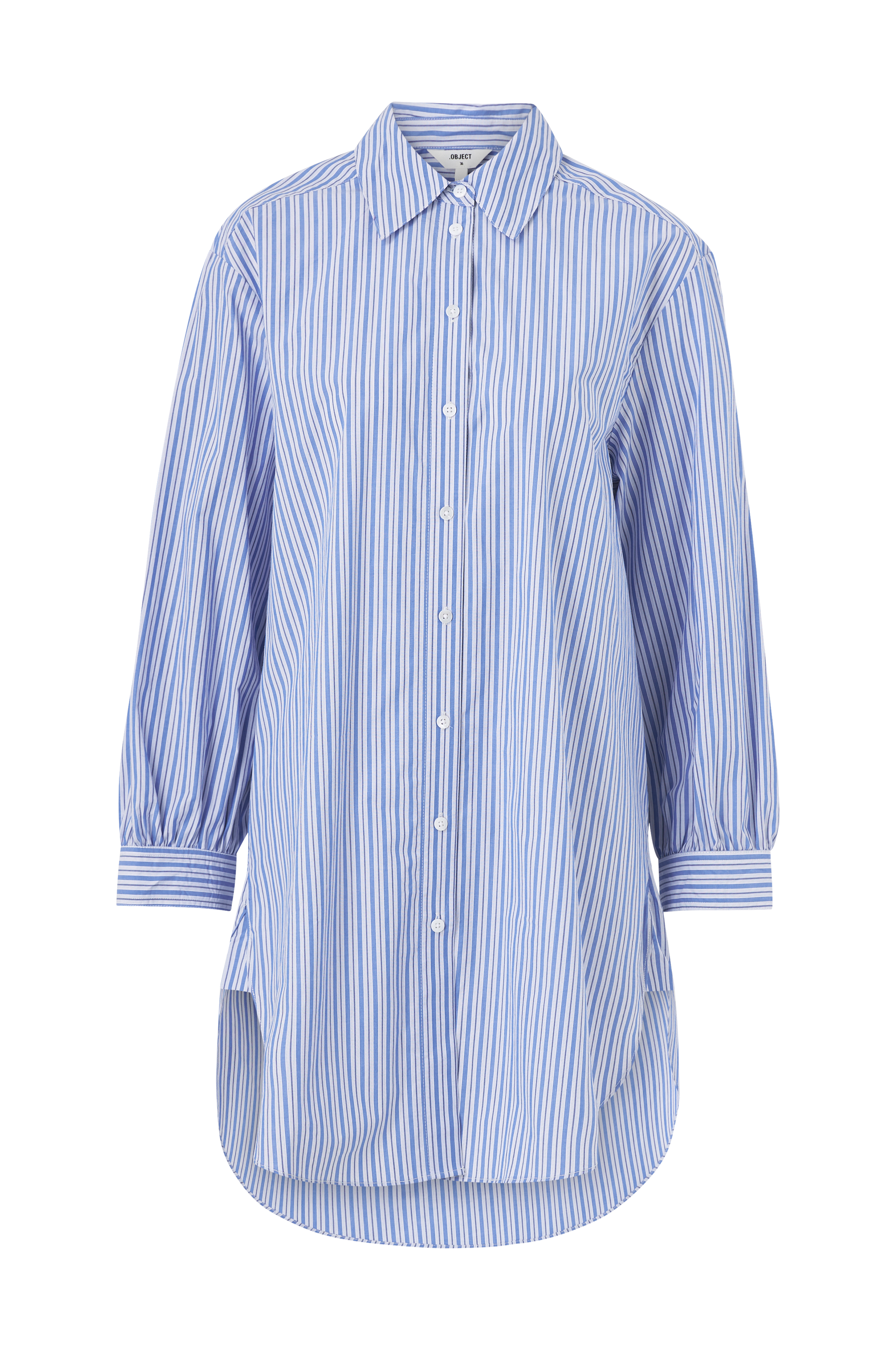 Lang oversizemodell med litt stor krage og knapping hele veien foran. Avskåret bærestykke med stort, lagt legg bak og lange ermer med mansjett i ermekantene. Rundskåret splitt med innfelling nederst i sidene og lenger bakstykke. Lengde bak ca. 99 cm i str 36.