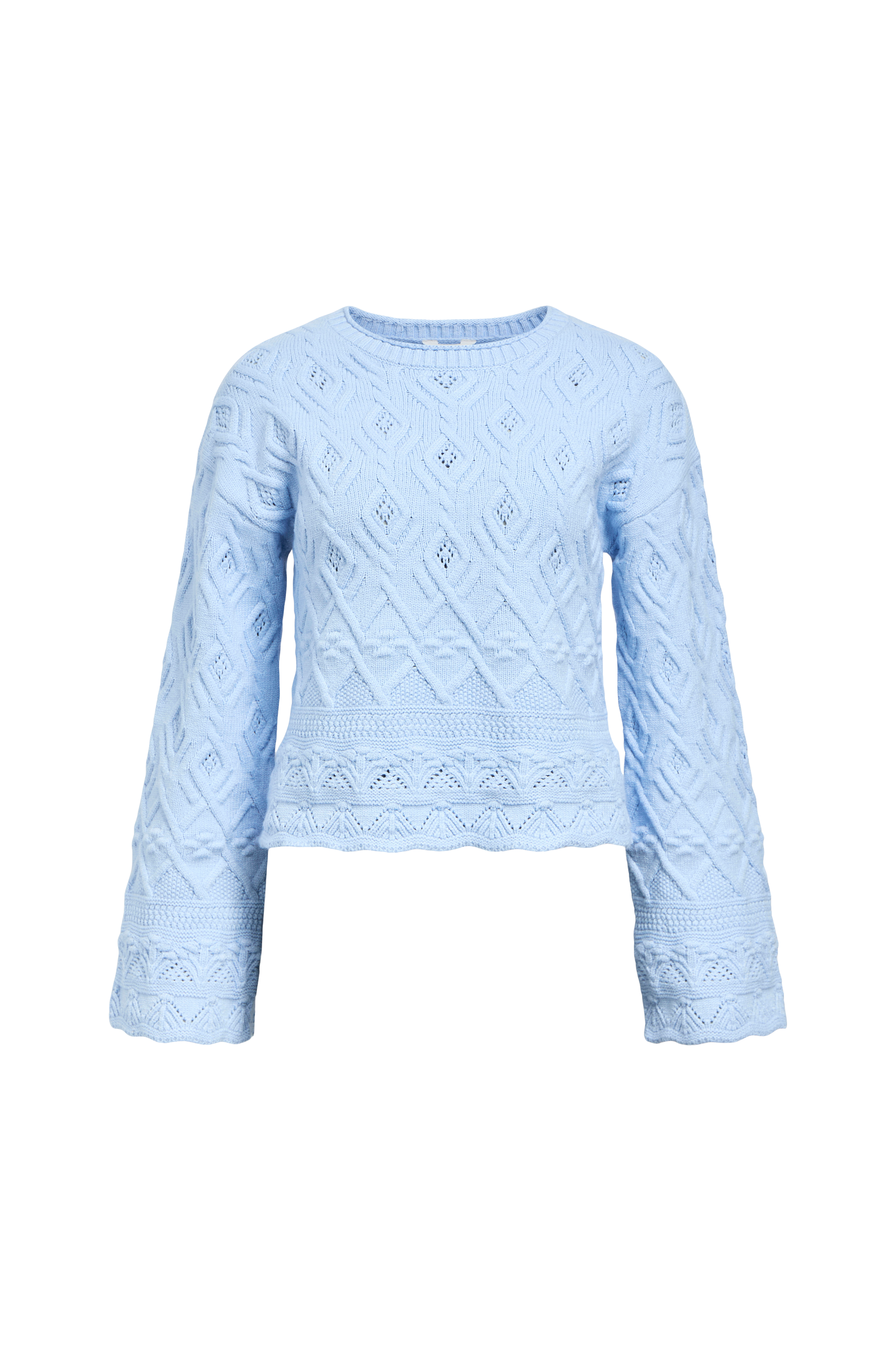 • Litt tykkere pullover i viskoseblanding med strukturstrikket mønster• Avrundet hals• Lange, brede ermer med utringede skuldre• Bølgede kanter ved armenden og på bunnen• Løs passform