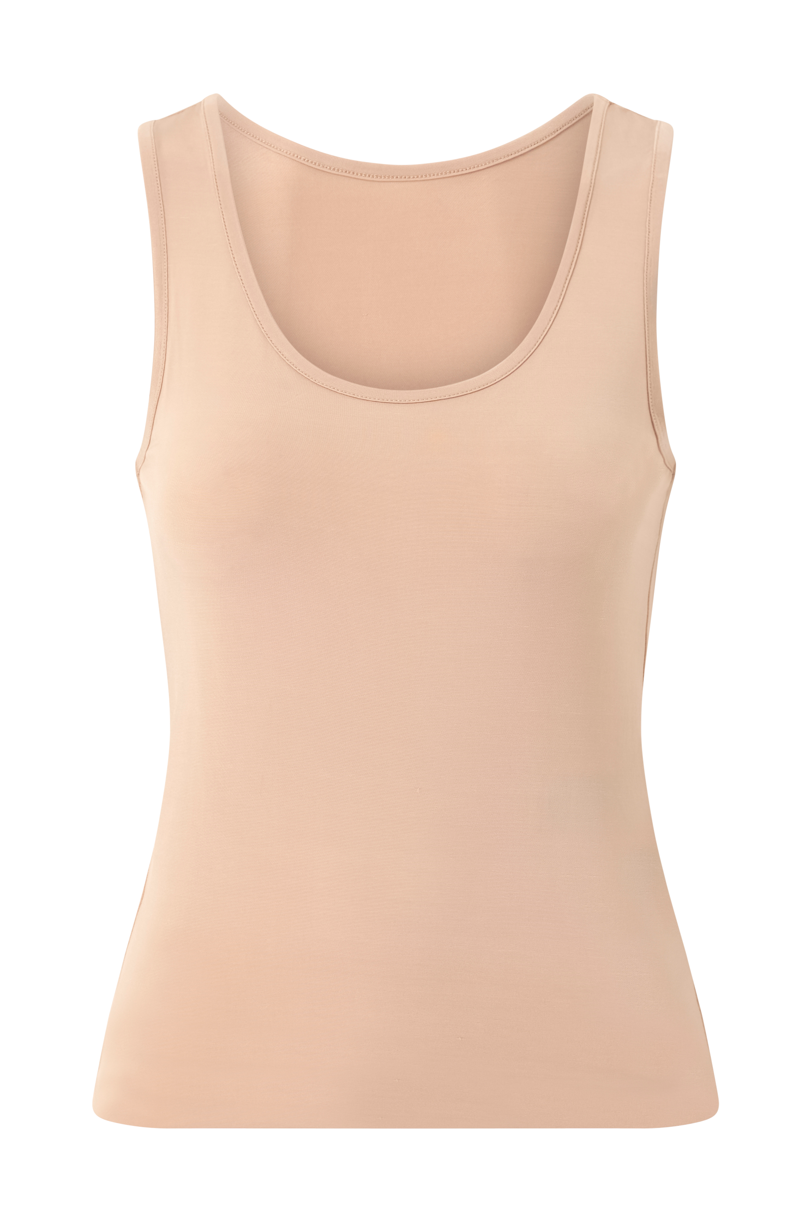 • Ermløs, figurnær passform topp i skinnende tricot• Utringning• Kan brukes med begge sider fremover