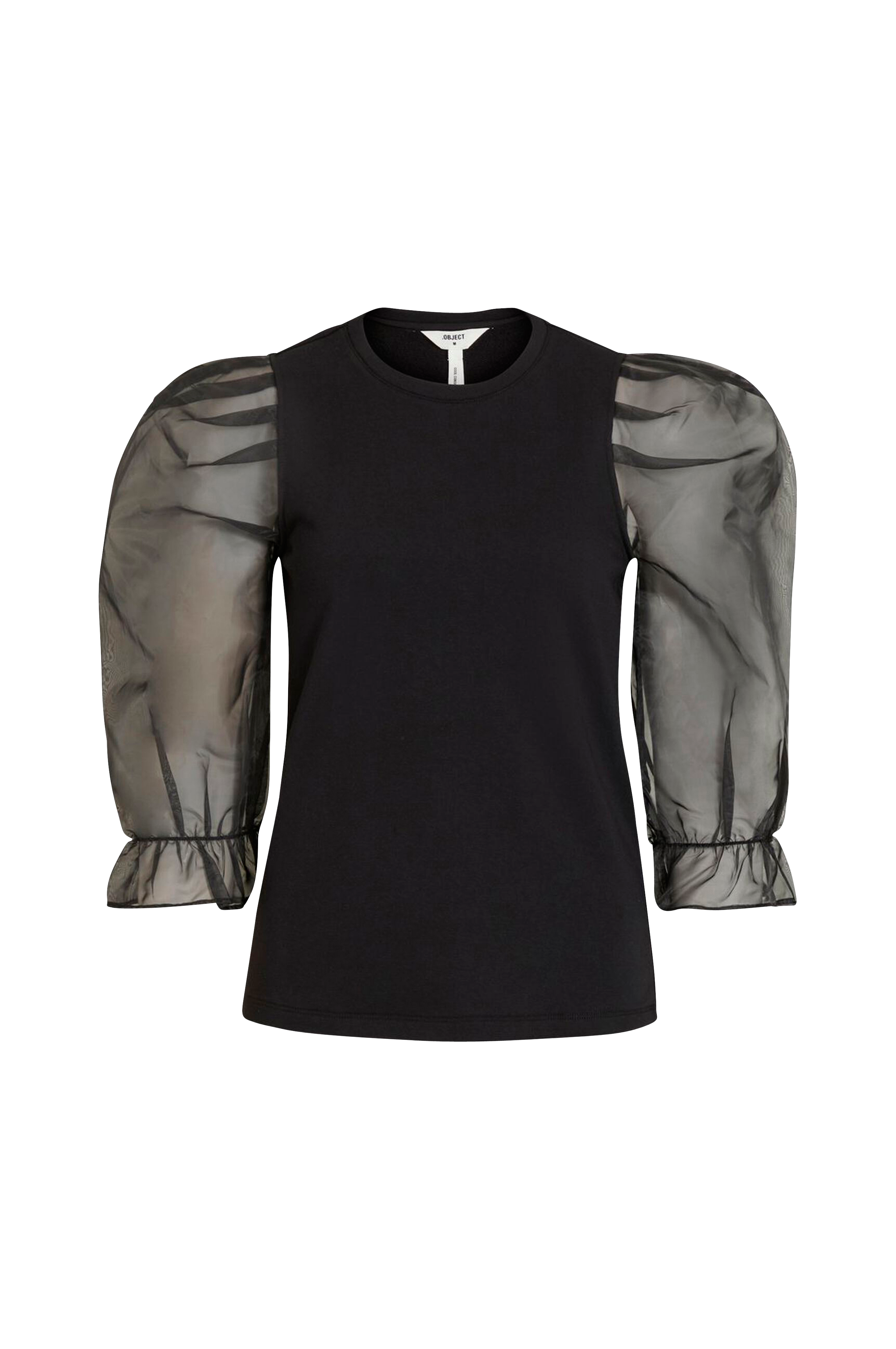 Topp objElin 3/4 Top fra Object. Lett figurformet modell i sweatshirtkvalitet med puffermer i mesh som har rynker ved skulderen og strikksøm nederst. Rund hals med liten vrangbord.