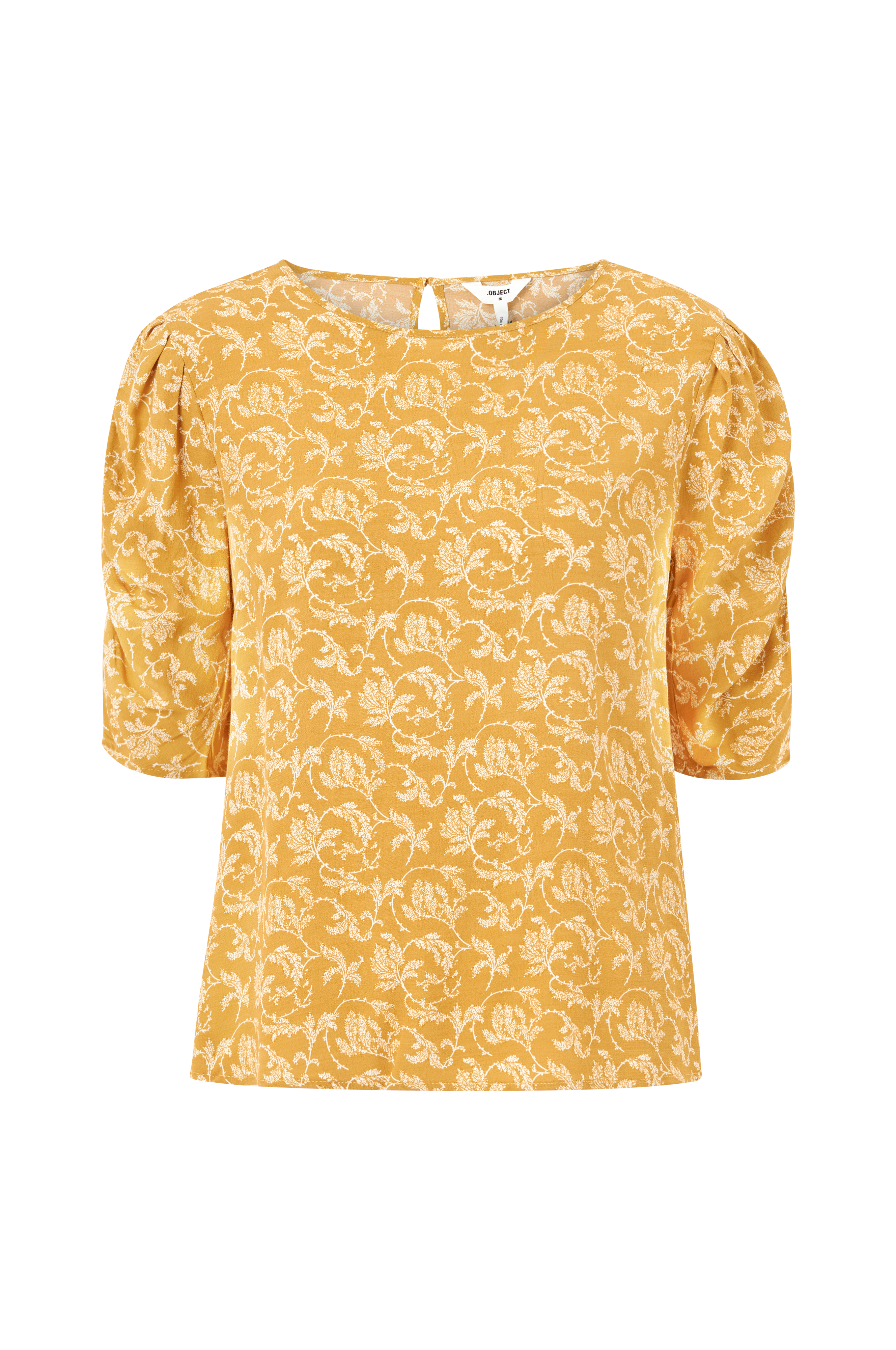 Topp i rett modell med ledig snitt. Rund hals med smal båndkanting og splitt med knapp i nakken. Halvlange puffermer med elastisk drapering langs oversiden.