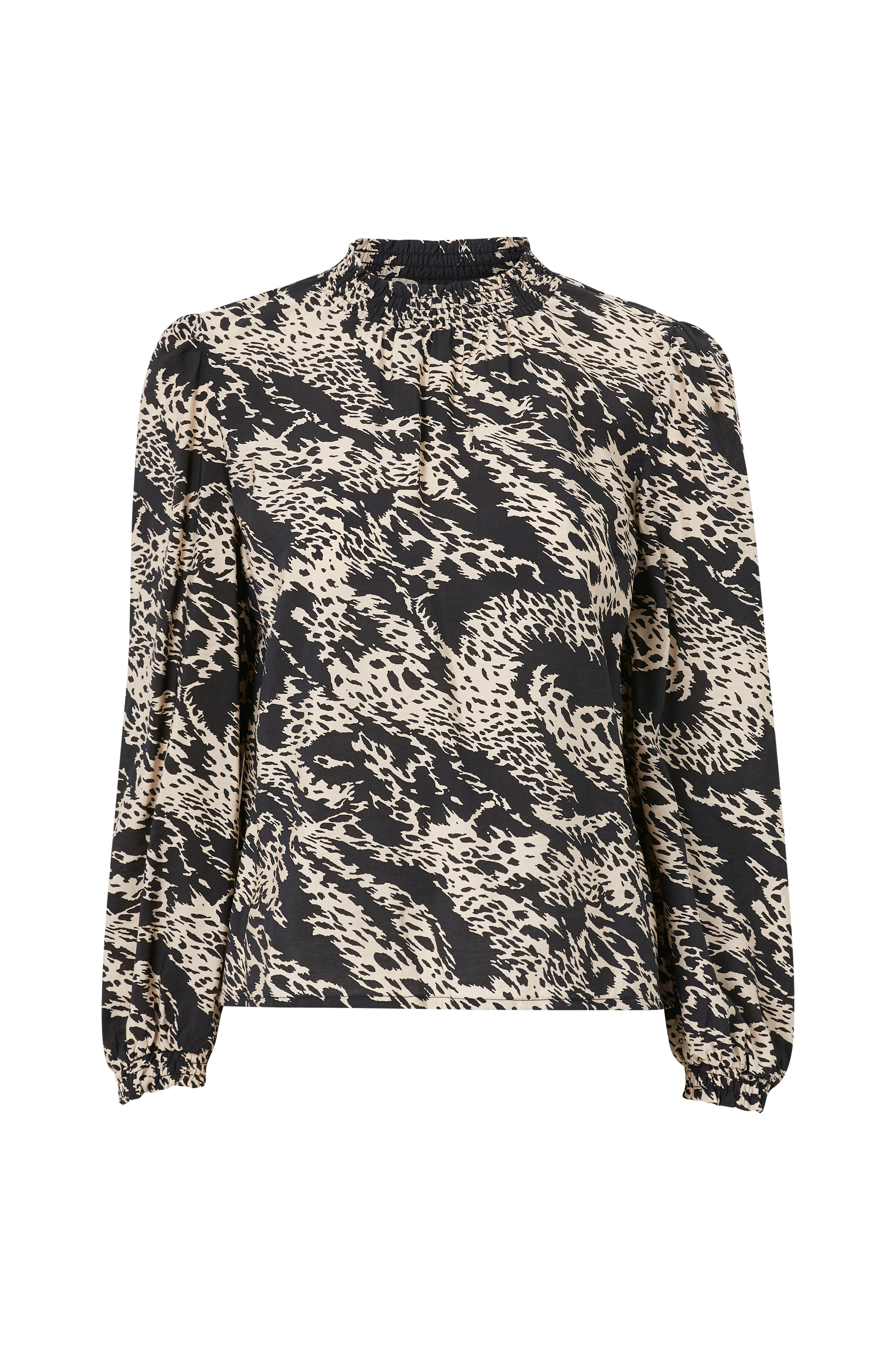 Rett modell med ledig snitt og halvhøy krage i vaffelsøm. Lange puffermer med rynker ved skuldrene og smal vaffelsøm i ermekantene.